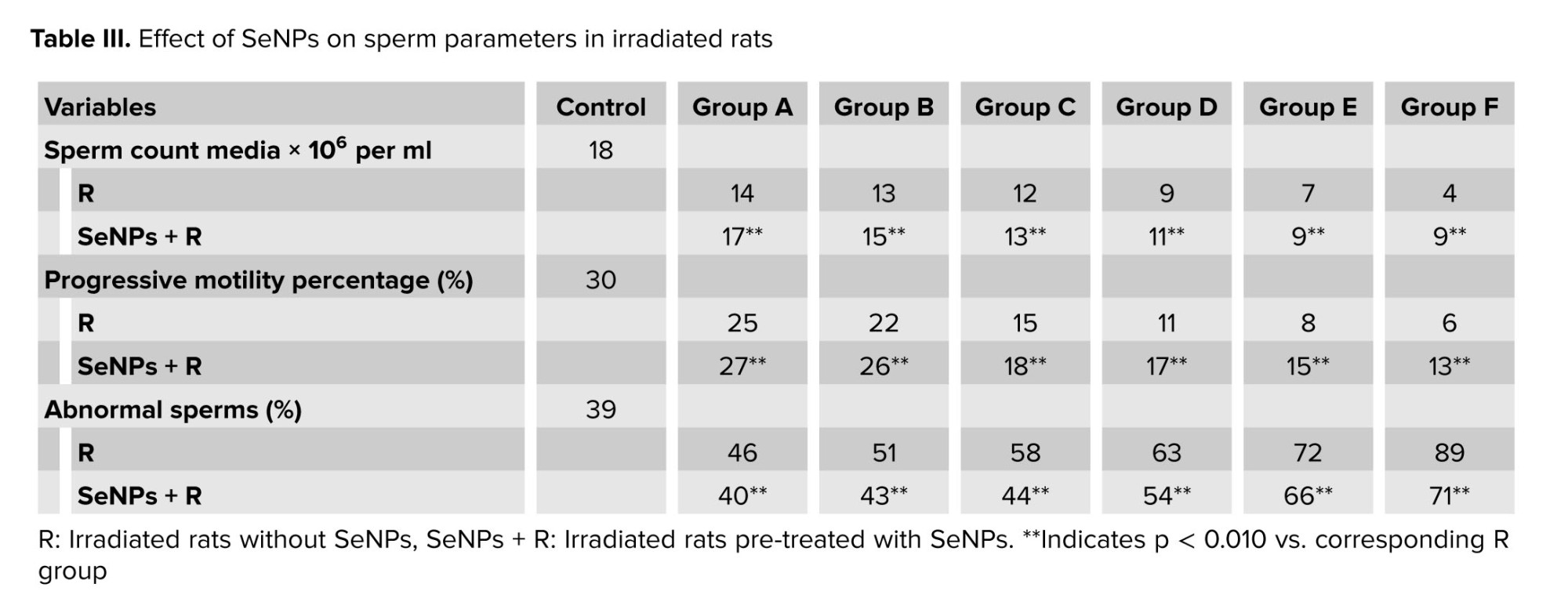 Table III presents the sperm count, median progressive motility, and abnormal sperm percentage for each group, compared with the control group.