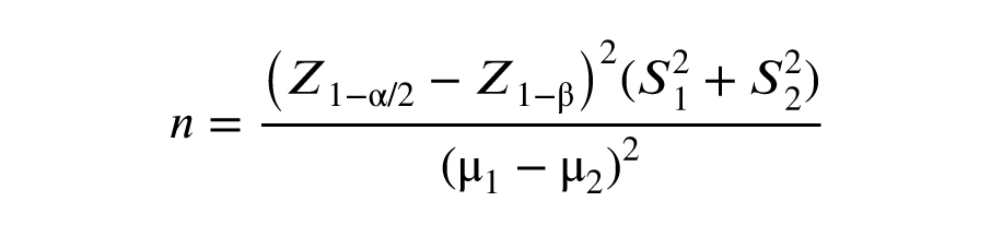 The symbols S1 and S2 denote the standard deviations, while µ1 and µ2 represent the means for group 1 and group 2, respectively.