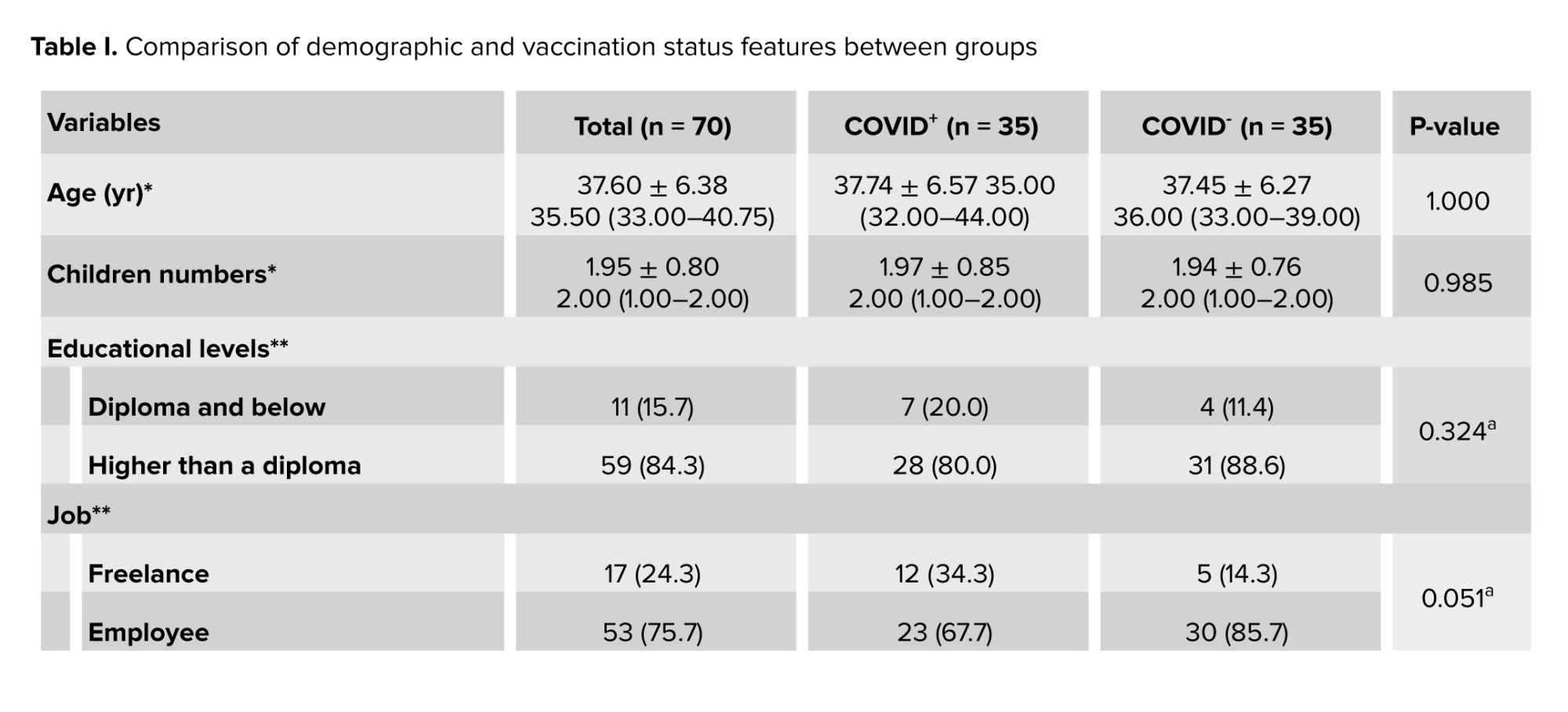 Participants in the 2 groups had no significant differences in terms of age, educational levels, job status, number of children, and vaccination history. All non-hospitalized participants reported at least one COVID-19 symptom during the acute phase of the infection. None of the individuals enrolled in the current study had sexually transmitted or other diseases such as AIDS, varicocele, etc.