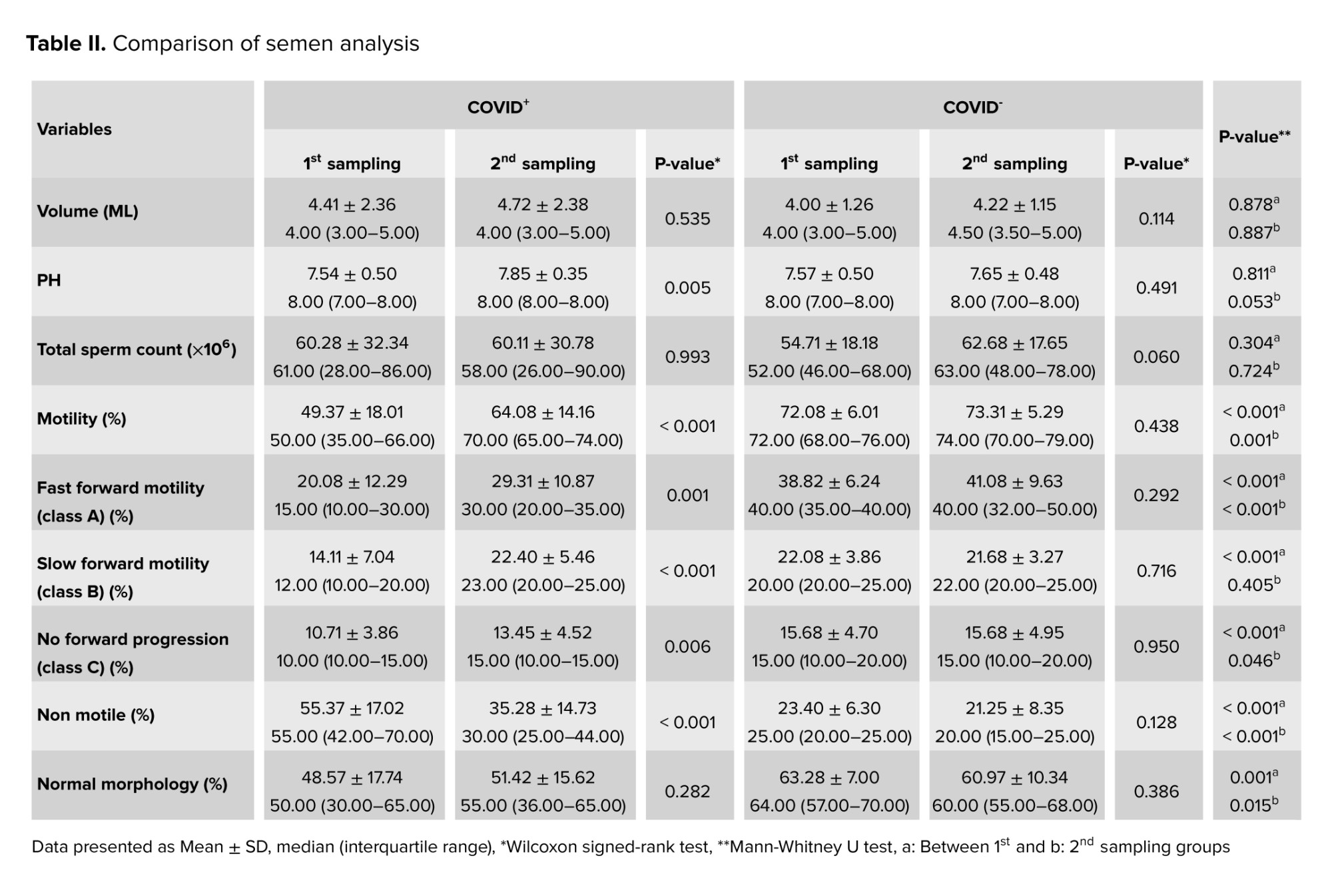 According to the results, significant within-group differences were observed in the COVID+ group between the 1st (i.e., acute phase) and 2nd (i.e., chronic phase) sampling periods regarding semen pH and sperm motility categories (i.e., fast forward motility; class A, slow forward motility; class B, no forward progression; class C, and non-motile) as shown in table II.
