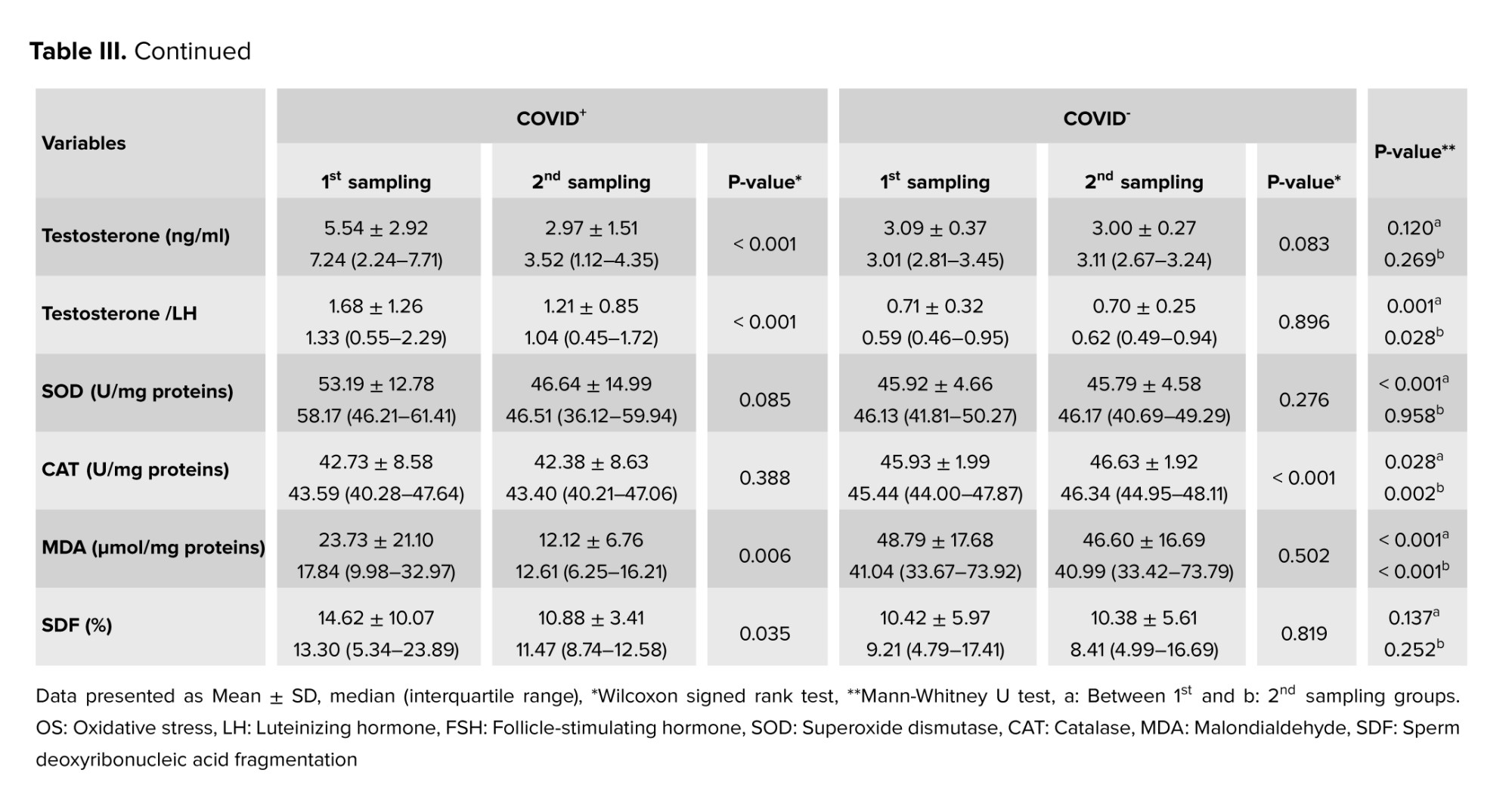 The present study aimed to investigate the acute and long-term effects of the Omicron variant of SARS-CoV-2 virus on several aspects of male reproductive function by analyzing semen parameters, OS markers such as malondialdehyde (MDA), superoxide dismutase (SOD), and catalase (CAT), as well as direct detection of SARS-CoV-2 in semen using reverse transcription polymerase chain reaction (RT-PCR). Additionally, blood levels of gonadotropin hormones, such as follicle-stimulating hormone (FSH), luteinizing hormone (LH), and testosterone, as well as SDF, were evaluated.