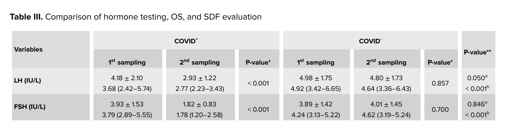 The analysis of FSH and LH levels revealed a statistically significant difference between the first and second sampling periods in the COVID+ group (p < 0.001). In contrast, no significant difference was detected between the 2 periods in the COVID- group (p > 0.05). Also, no significant difference was observed between the 2 groups in the first (i.e., acute phase) sampling (p > 0.05), but a marked difference in hormone levels emerged in the second (i.e., chronic phase) sampling episode (p < 0.001). Regarding testosterone levels, no significant difference was observed between the study groups either in the first (p = 0.120) or second (p = 0.269) sampling periods. However, a significant difference was found regarding testosterone/LH levels between the first and second periods in the COVID+ group (p < 0.001), but not in the COVID- group (p = 0.896). Additionally, significant differences were observed between the groups regarding hormonal levels during the first and second sampling periods (p > 0.05, Table III).