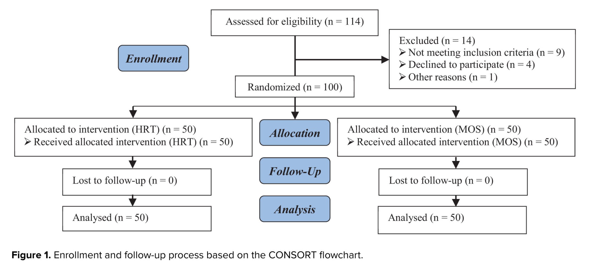 Participants were randomly allocated to either the HRT or MOS group using block randomization, with numbers generated by the random allocation software. The total number of groups and the sample size were entered into the software, and block randomization was then applied. Participants were assigned to either the intervention or control group based on the random numbers generated.