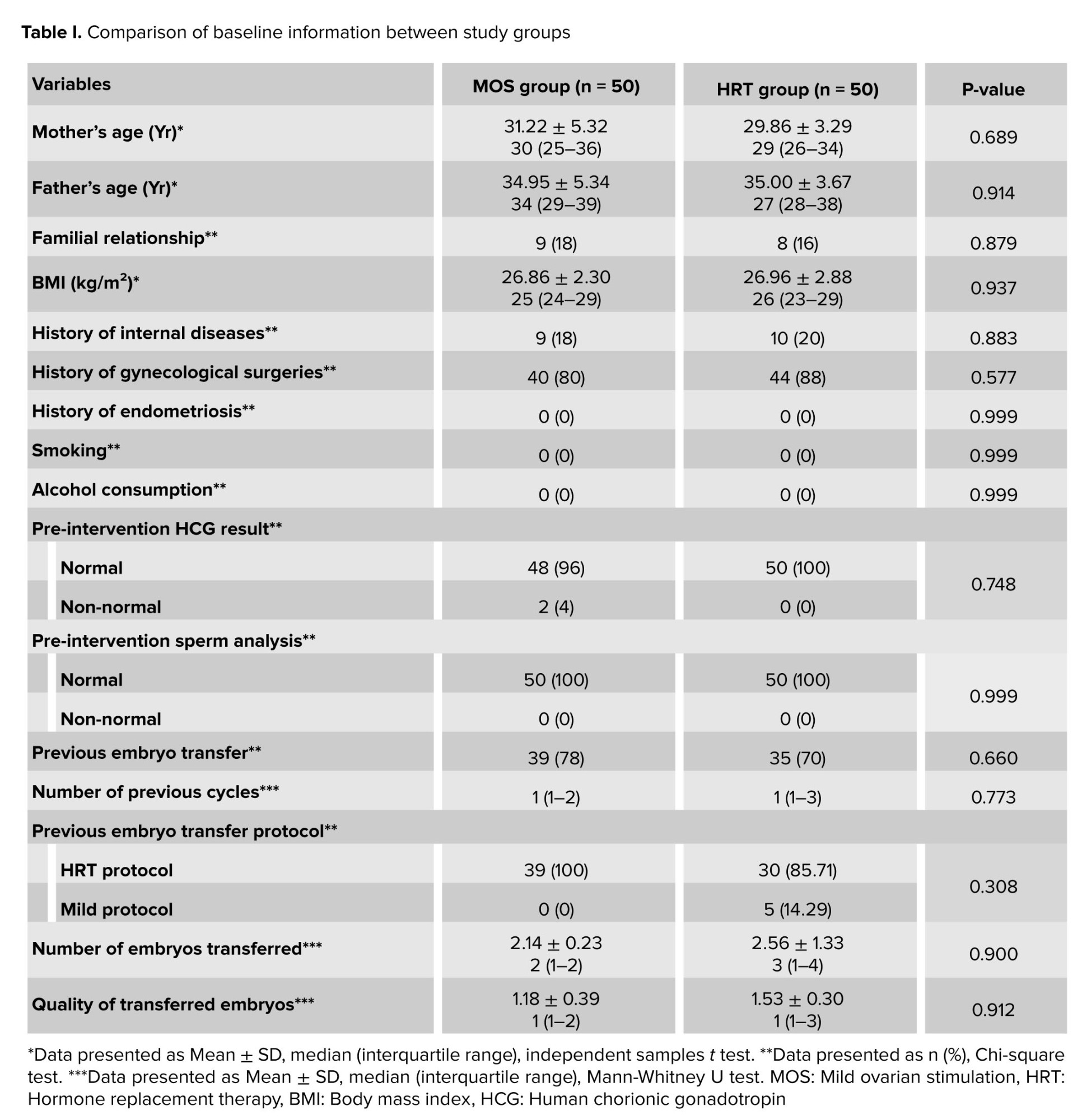 In this study, a comprehensive range of variables were evaluated to compare outcomes between the MOS and HRT groups. Baseline demographic characteristics included maternal and paternal age, body mass index (BMI), and the presence of consanguinity between spouses (which was recorded because genetic proximity between spouses may influence reproductive outcomes through inherited conditions or subclinical genetic factors), prior gynecologic surgeries, and history of endometriosis. Lifestyle‑related factors, such as cigarette smoking and alcohol consumption, were also recorded for each participant and/or her spouse. Reproductive history variables comprised pre-intervention HCG levels, sperm analysis results, previous embryo transfer attempts, the number of prior cycles, and the type of embryo transfer protocol used. Serum HCG was assessed only to rule out spontaneous pregnancy before cycle initiation and was not included in comparative outcome analyses. Data related to embryo transfer included the number and quality of embryos transferred. Biochemical and hormonal profiles were assessed through measurements of fasting blood sugar, triglycerides, total cholesterol, low-density lipoprotein, high-density lipoprotein, prolactin, follicle-stimulating hormone (FSH), anti-Müllerian hormone, thyroid-stimulating hormone, and vitamin D3 levels. Clinical outcomes included rates of chemical and clinical pregnancy, as well as final pregnancy outcomes such as miscarriage, ectopic pregnancy, and successful ongoing pregnancy. These variables were analyzed to determine any statistically significant differences between the 2 HRT and MOS groups.