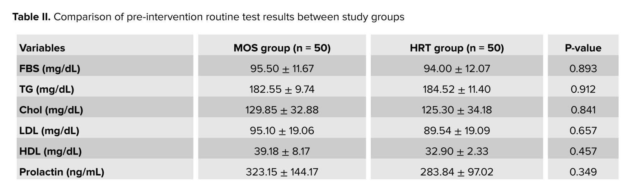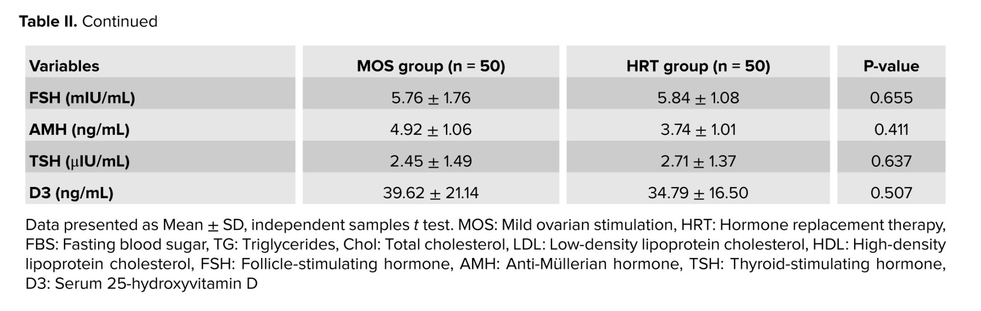 In this study, a comparison of routine pre-intervention tests between the 2 groups, MOS and HRT, revealed no significant differences in several variables. The fasting blood sugar, triglycerides, cholesterol, low‑density lipoprotein, high‑density lipoprotein, prolactin, FSH, anti‑Müllerian hormone, thyroid‑stimulating hormone, and D3 levels did not differ significantly between groups (p > 0.05) (Table II).