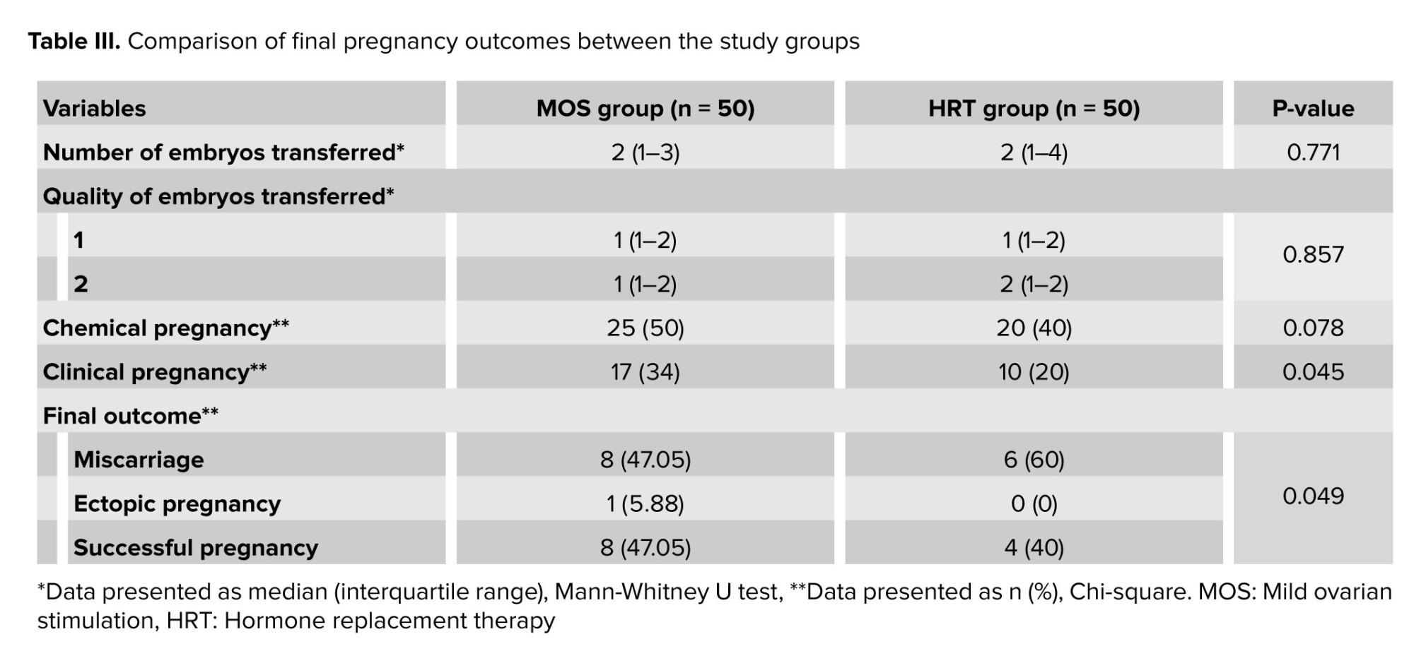 Final study results regarding chemical pregnancy, clinical pregnancy, and final pregnancy outcome indicated that the number of embryos transferred (p = 0.771) and their quality (p = 0.857) were nearly identical between the 2 groups. The chemical pregnancy rate was higher in the MOS group (25 cases) compared to the HRT group (20 cases), but this difference was not statistically significant (p = 0.078). However, the clinical pregnancy rate (p = 0.045) and successful pregnancy rate (p = 0.049) were significantly higher in the MOS group than in the HRT group (Table III).