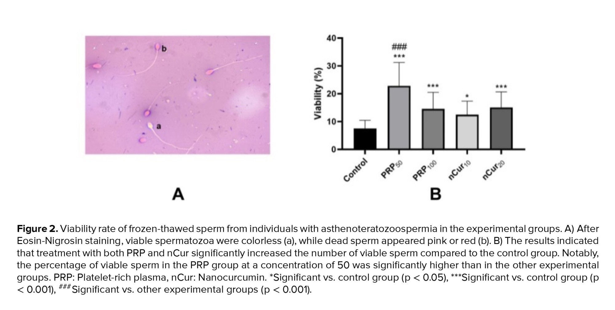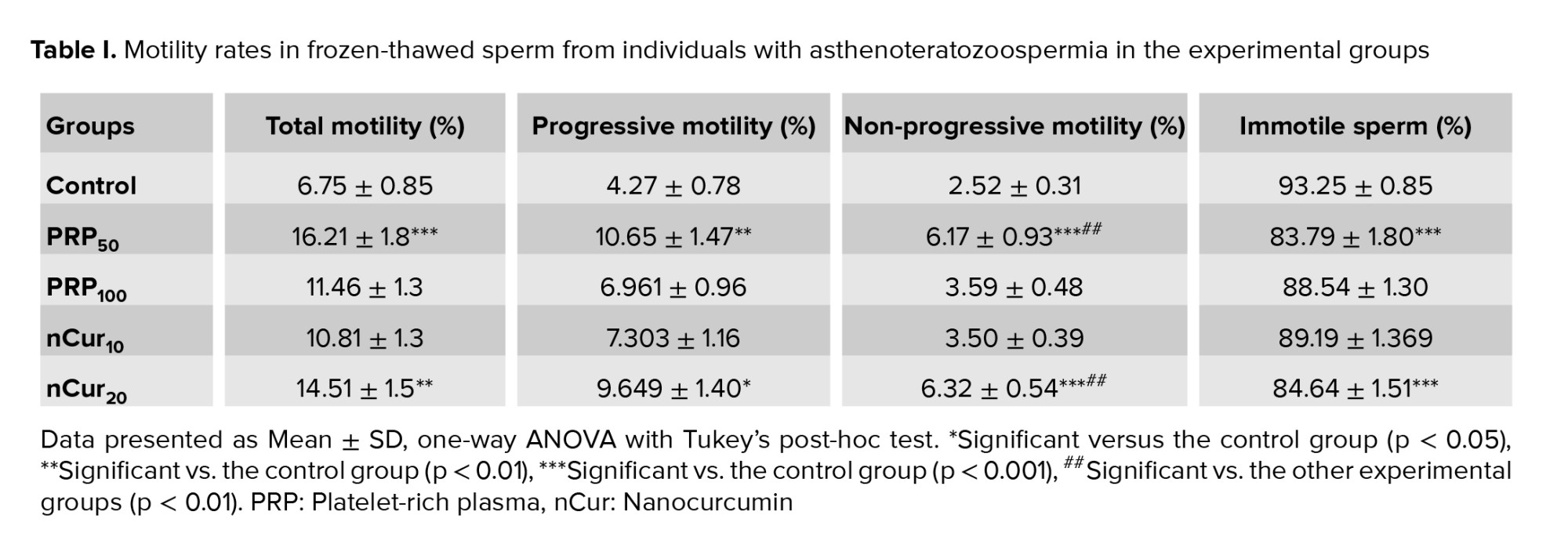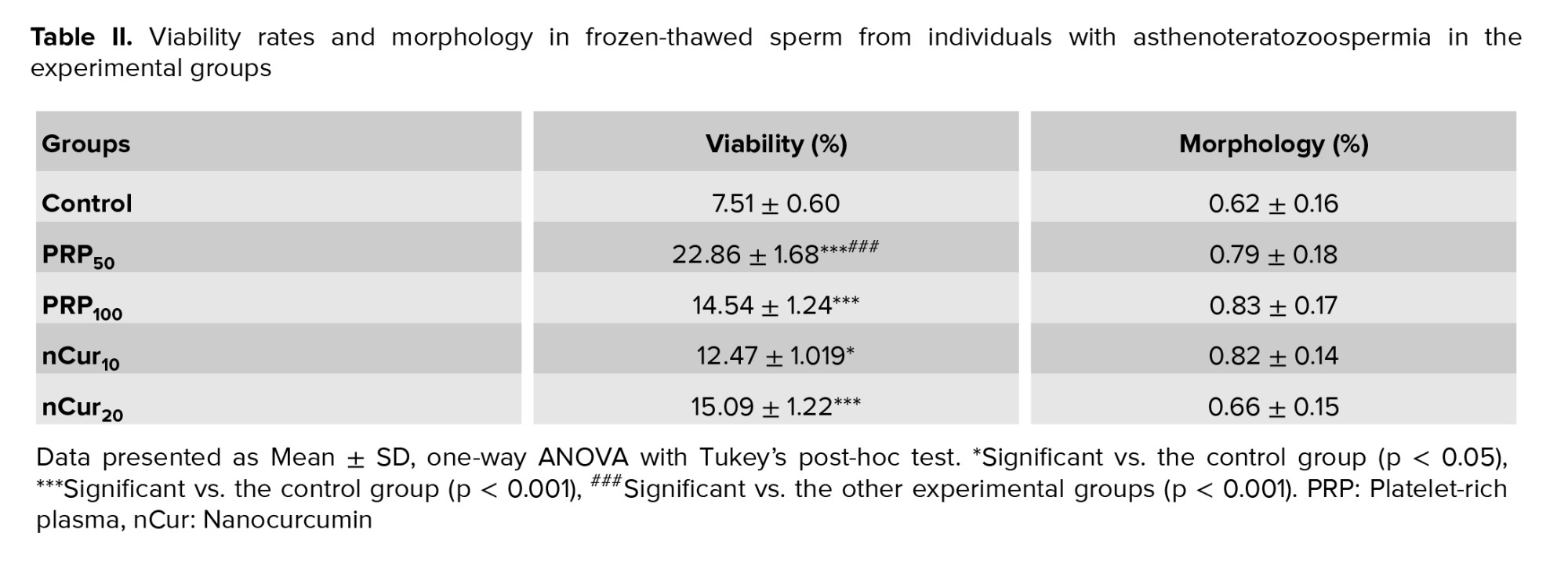 In this study, at first, the samples were incubated at 37°C for 30 min for liquification. Then, an equal volume of Ham's/F10 medium (HF10; BioIdea, Iran) was mixed with the semen and centrifuged at 3000 g for 6 min. After discarding the supernatant, 500 µl of HF10 was added to the pellet. The samples were then divided into 5 groups: control (no treatment), PRP50, PRP100, nCur10, and nCur20. Semen was gradually mixed with an equal volume of PRP or nCur, followed by the addition of sperm freezing medium (Cooper Surgical, Denmark) to the mixture. nCur (Exir Nano Sina, Iran) was added to each sample at concentrations of 10 µM (18) and 20 µM (12).