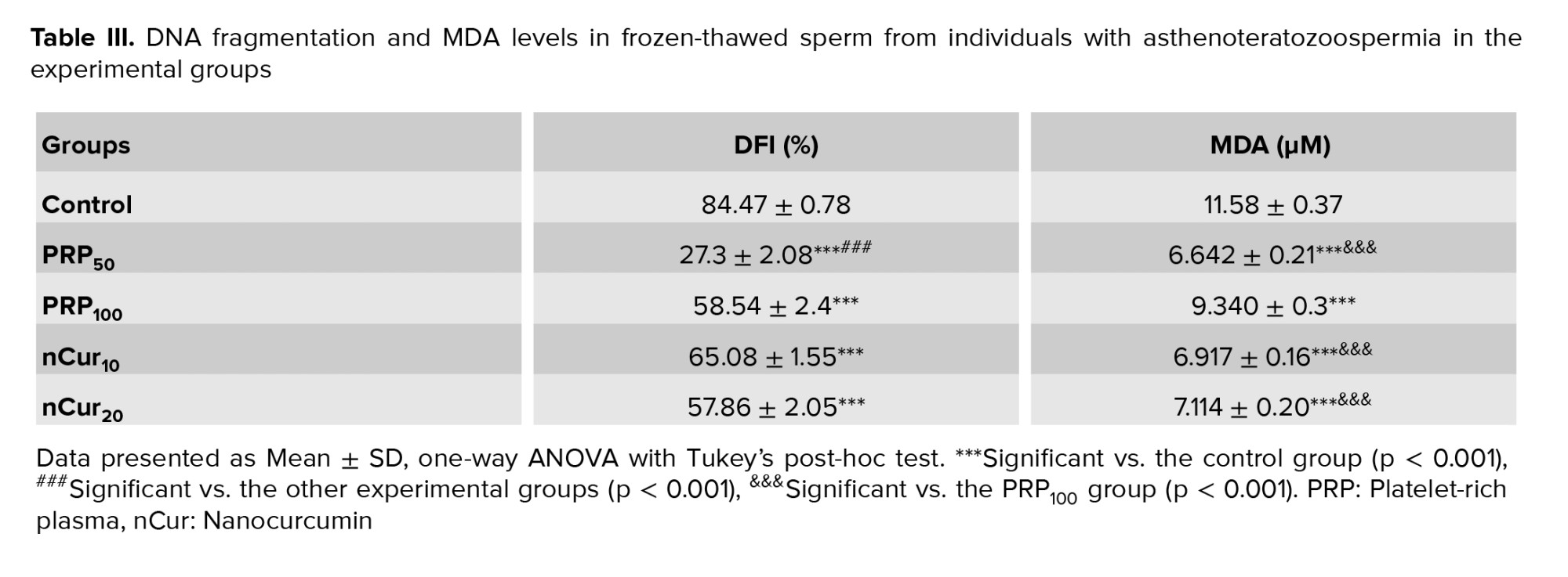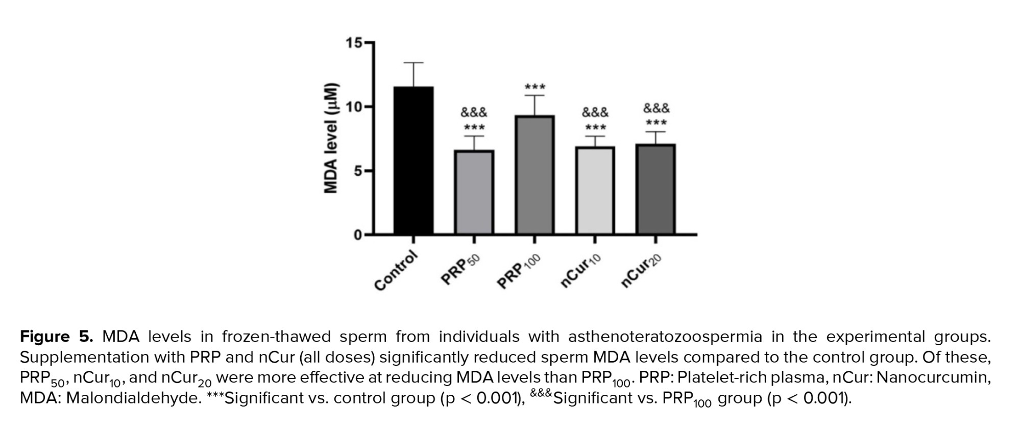 Freezing and thawing processes elevate the levels of free radicals. Among the most significant ROS generated are superoxide anions, which are quickly converted into hydrogen peroxide and oxygen by the SOD enzyme (23). Hydrogen peroxide is toxic to cells because it can cross cell membranes and generate hydroxyl radicals. These hydroxyl radicals, with their potent oxidizing properties, can cause substantial damage to biological systems and surrounding molecules (5). Elevated levels of hydrogen peroxide can inactivate the glycolytic enzyme glyceraldehyde-3-phosphate dehydrogenase, resulting in decreased ATP production and, consequently, reduced sperm motility (1). In this study, we aimed to mitigate the destructive effects of freezing on sperm quality by adding heterologous PRP, which is rich in platelets and growth factors, or nCur as an antioxidant to the freezing media. We then compared the effects of these products on sperm parameters, MDA levels, and DNA fragmentation. The concentrations of PRP used in this study were based on prior research demonstrating beneficial effects on sperm quality. Specifically, mixing sperm with autologous PRP at a concentration of 100×10³/µl improved sperm parameters in oligoasthenoteratozoospermic samples (23). Similarly, heterologous PRP at the same concentration enhanced sperm quality in healthy men (2). Therefore, we selected PRP doses around this concentration to evaluate their effects in our experimental setup. Regarding nCur, we supplemented the freezing medium with 10 µM and 20 µM concentrations. These doses were chosen based on previous studies investigating the antioxidant and protective effects of curcumin derivatives on sperm and reproductive cells, which reported efficacy within this concentration range (11, 18). By selecting these doses, we aimed to explore the potential cryoprotective effects of nCur while maintaining consistency with established literature.