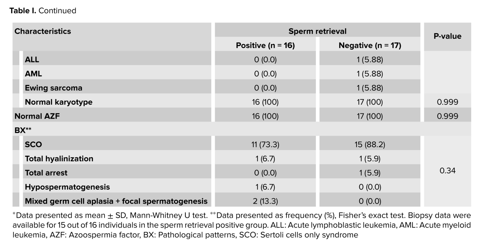 Data of 33 men suffering from post-chemotherapy NOA were included in this study. Table I represents baseline characteristics of study objects. Mean age at the start of chemotherapy and at the time of surgery were 21 ± 7.4 and 33.6 ± 5.6, respectively. Mean FSH, LH, and testosterone levels were 19.9 ± 13.5, 9.6 ± 5.3, and 3.4 ± 1.5, respectively, which indicates primary spermatogenic failure. The most dominant cancer among cases was Hodgkin's lymphoma (39.39%).