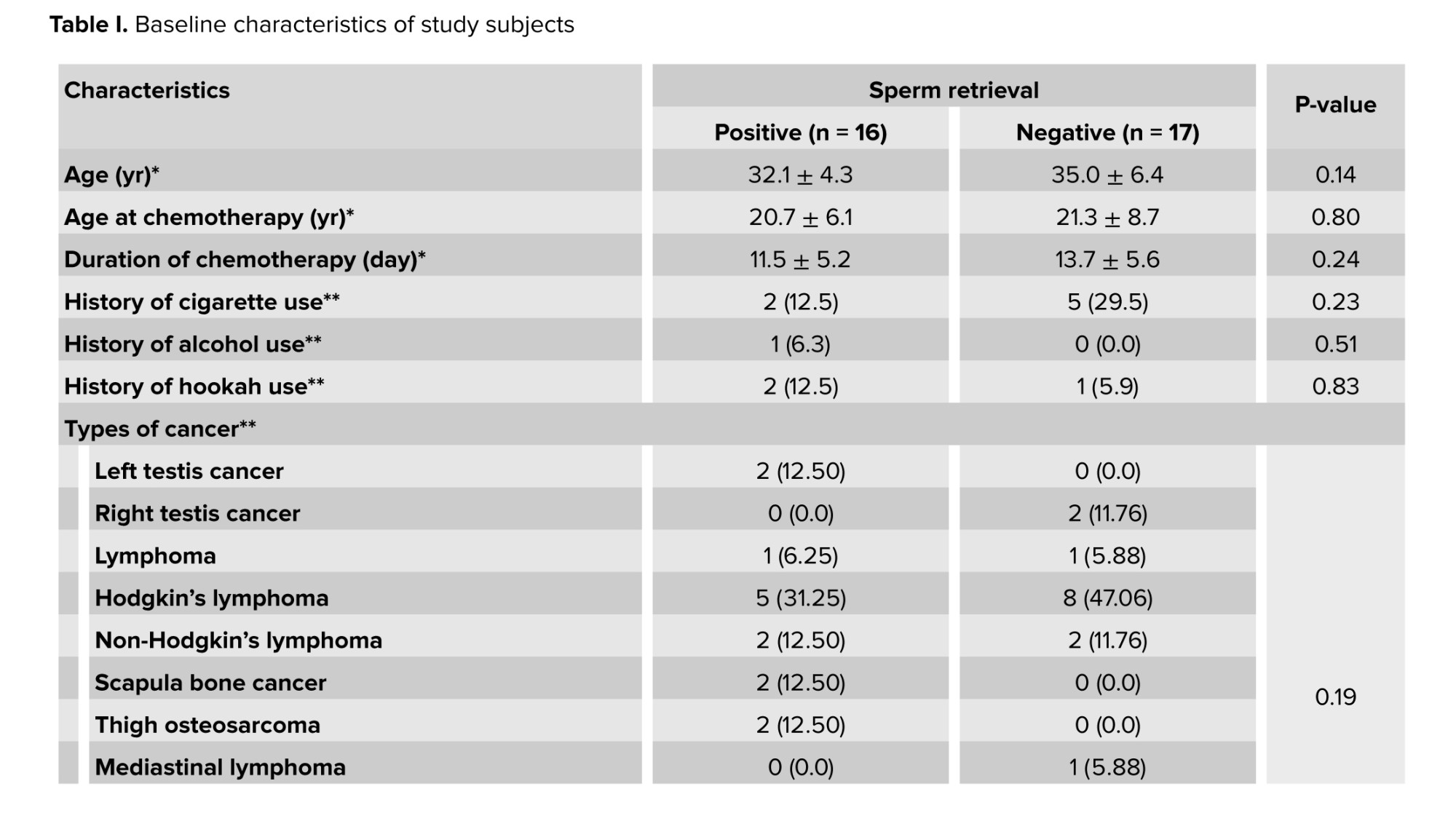In this cross-sectional study, we reviewed the medical records of 33 men with NOA secondary to chemotherapy for different types of malignancies, who underwent micro-TESE followed by ICSI, and were referred to Royan Institute for Reproductive Biomedicine (Tehran, Iran) between 2010 and 2023. Extracted data included baseline characteristics, such as age, type of malignancies, duration of chemotherapy treatment, serum levels of testosterone, follicle-stimulating hormone (FSH), and luteinizing hormone (LH), history of cigarette, alcohol, or hookah use, as well as diametric features of the testes (measured using an orchidometer and ultrasound examination). This study was retrospective in nature. Accordingly, the sample size was based on the total number of eligible patients referred to our institution and met the inclusion criteria. No sample size calculation was performed prior to data collection, and no interim analysis or stopping rules were applied.