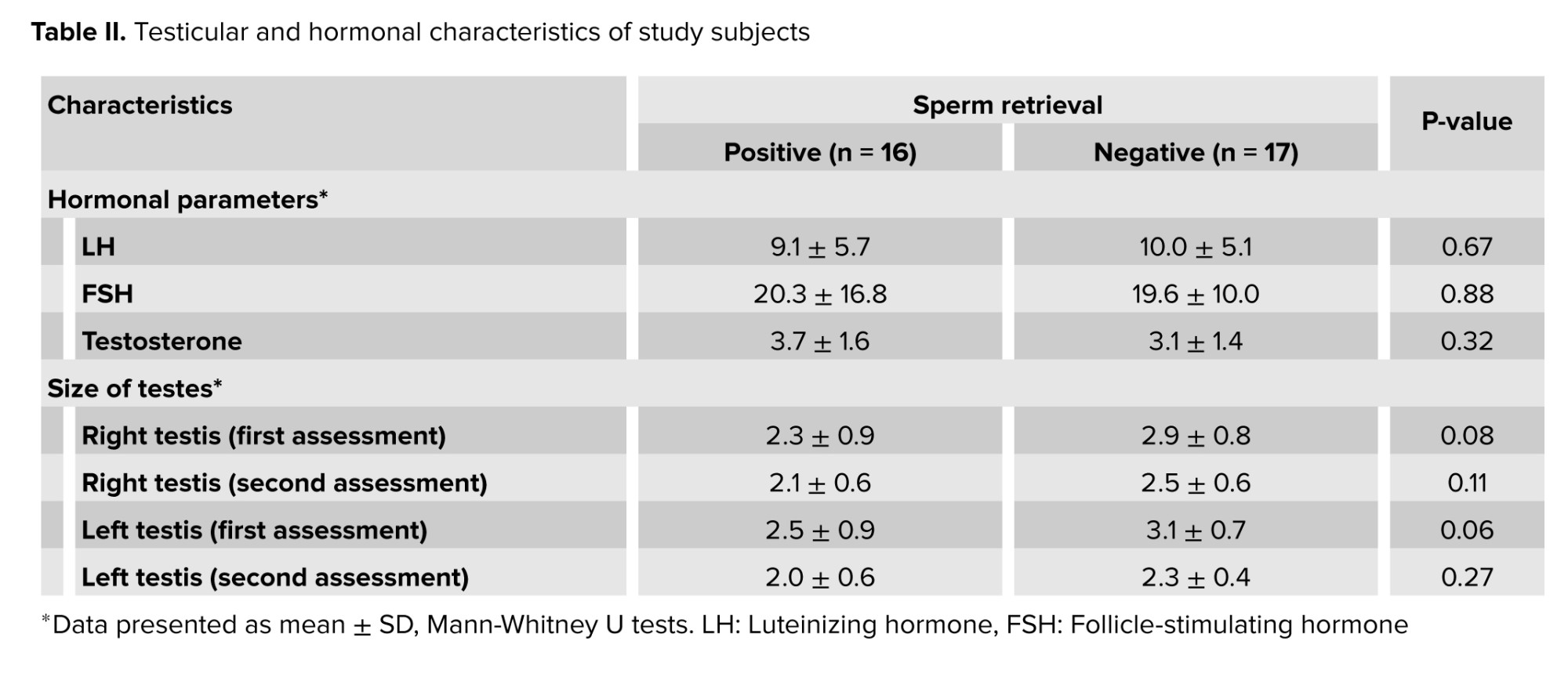 The serum levels of sexual hormones, including testosterone, FSH, and LH, were also not different between the 2 groups. Overall, none of the factors studied were significant between the 2 groups with or without sperm extraction.