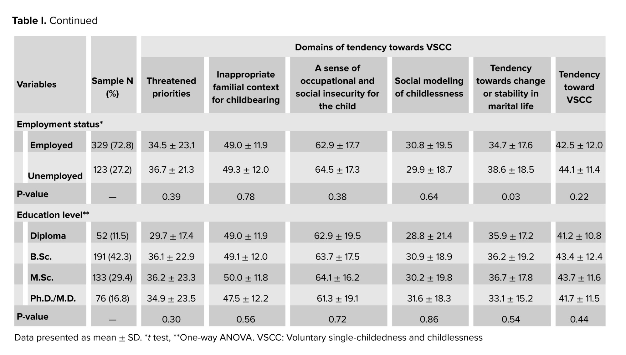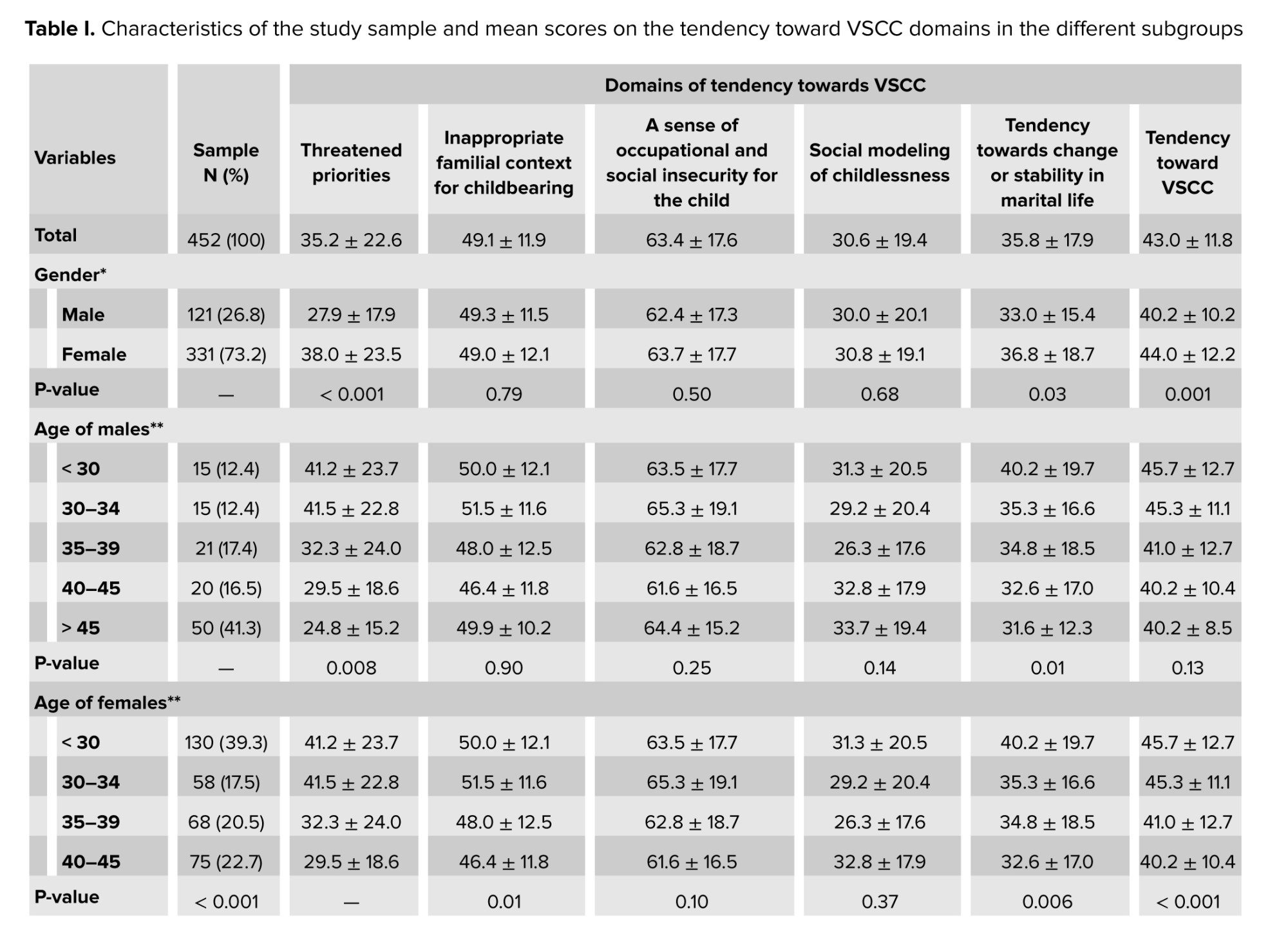 Regarding employment status, unemployed participants showed a significantly higher tendency in the "tendency toward change or stability in marital life" domain compared to employed individuals (p = 0.03). Age-based comparisons indicated that younger participants (under 30 yr), both male and female, generally reported higher scores in specific domains compared to older age groups. Specifically, females under 30 showed the strongest inclination toward VSCC across most domains (p < 0.001). Educational level did not show significant associations with any VSCC domain or the total score (Table I).
