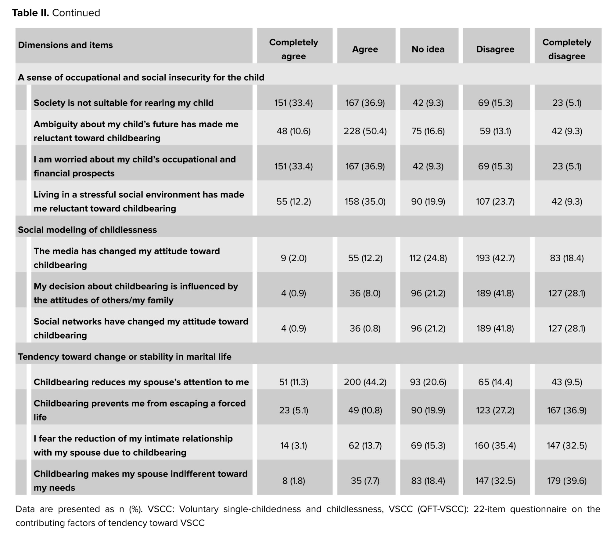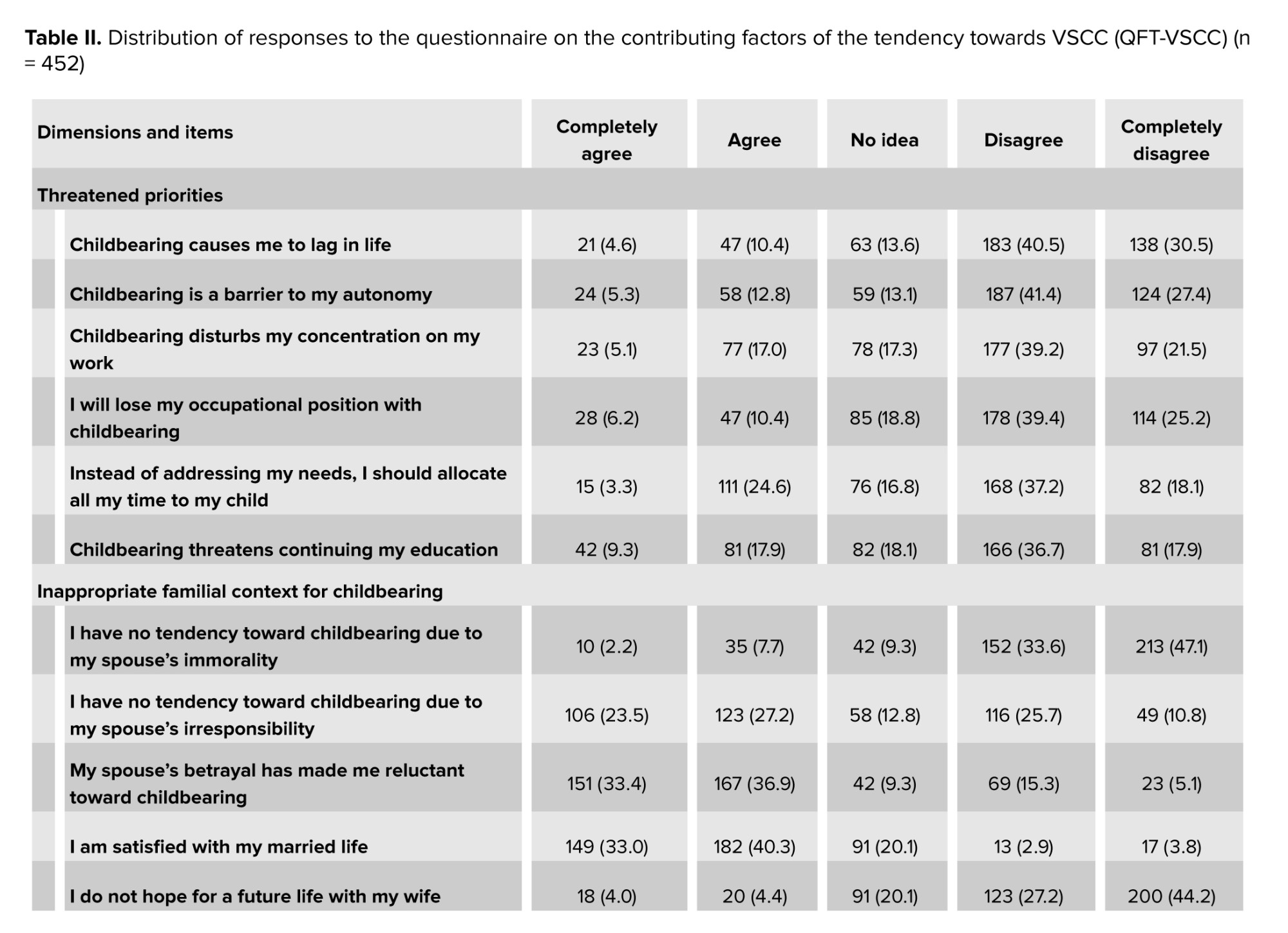 Table II presents the item-level analysis of responses. In the "threatened priorities" dimension, participants expressed concerns regarding the impact of childbearing on continuing education and work concentration. In the "inappropriate familial context" dimension, despite high reported marital satisfaction, a notable proportion indicated that perceived spousal betrayal influenced their childbearing decisions.