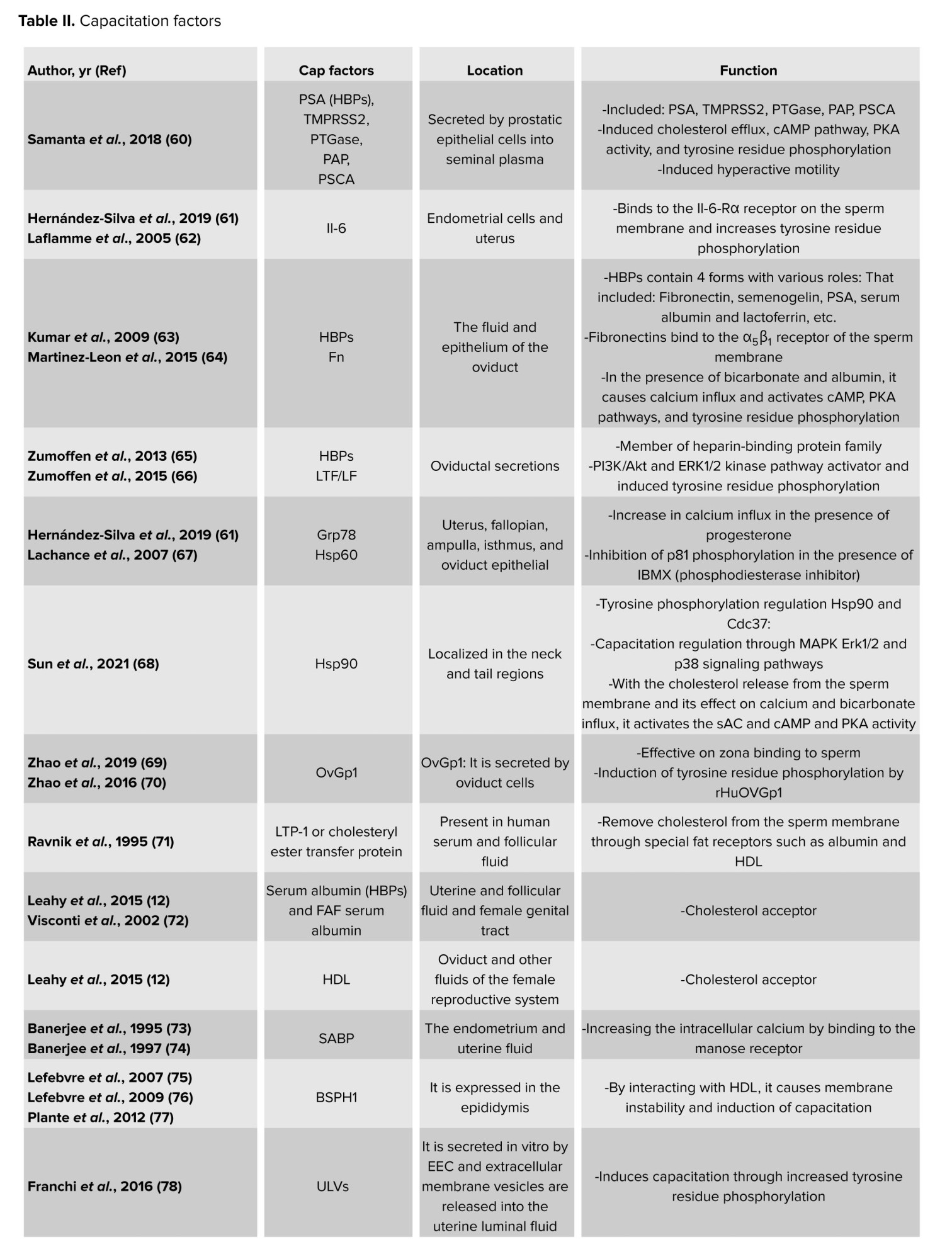 The first step for inducing capacitation is the extraction of sperm membrane-stabilizing elements in the cervical mucus. The last stages of sperm migration in the female reproductive system are the acrosome response and egg fertilization (51, 52). Decapacitation factors, as previously indicated, aid in stabilizing the cell membrane to prevent sperm from undergoing capacitation prematurely before reaching the female reproductive tract, thus protecting them from early capacitation processes (8-10). When sperm enter the female reproductive tract, the decapacitation factors are eliminated (53), and several molecular processes occur. These include the removal of cholesterol from the sperm plasma membrane, an increase in the membrane’s fluidity and permeability (54), the influx of Ca2+ into the sperm cell, the phosphorylation of tyrosine residues in several proteins, the initiation of signaling cascade pathways that lead to capacitation, and the conversion of sperm motility to hyperactive motility (55). According to recent research, factors that cause capacitation or decapacitation may affect the processes involved in capacitation utilizing secretory routes or external membrane vesicles like prostasomes (56), which carry proteins, lipids, DNA, micro ribonucleic acid, and messenger ribonucleic acid (57-59). A selection of the key capacitation protein factors is displayed in table II. More protein families that could have several proteins engaged in the capacitation process are also included in this table.