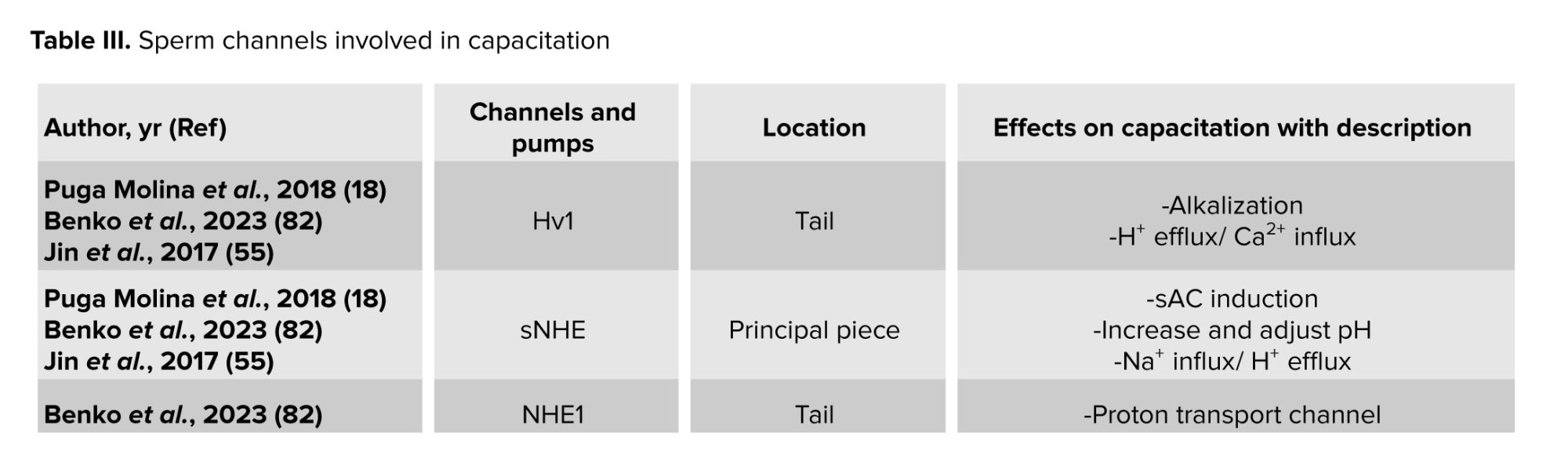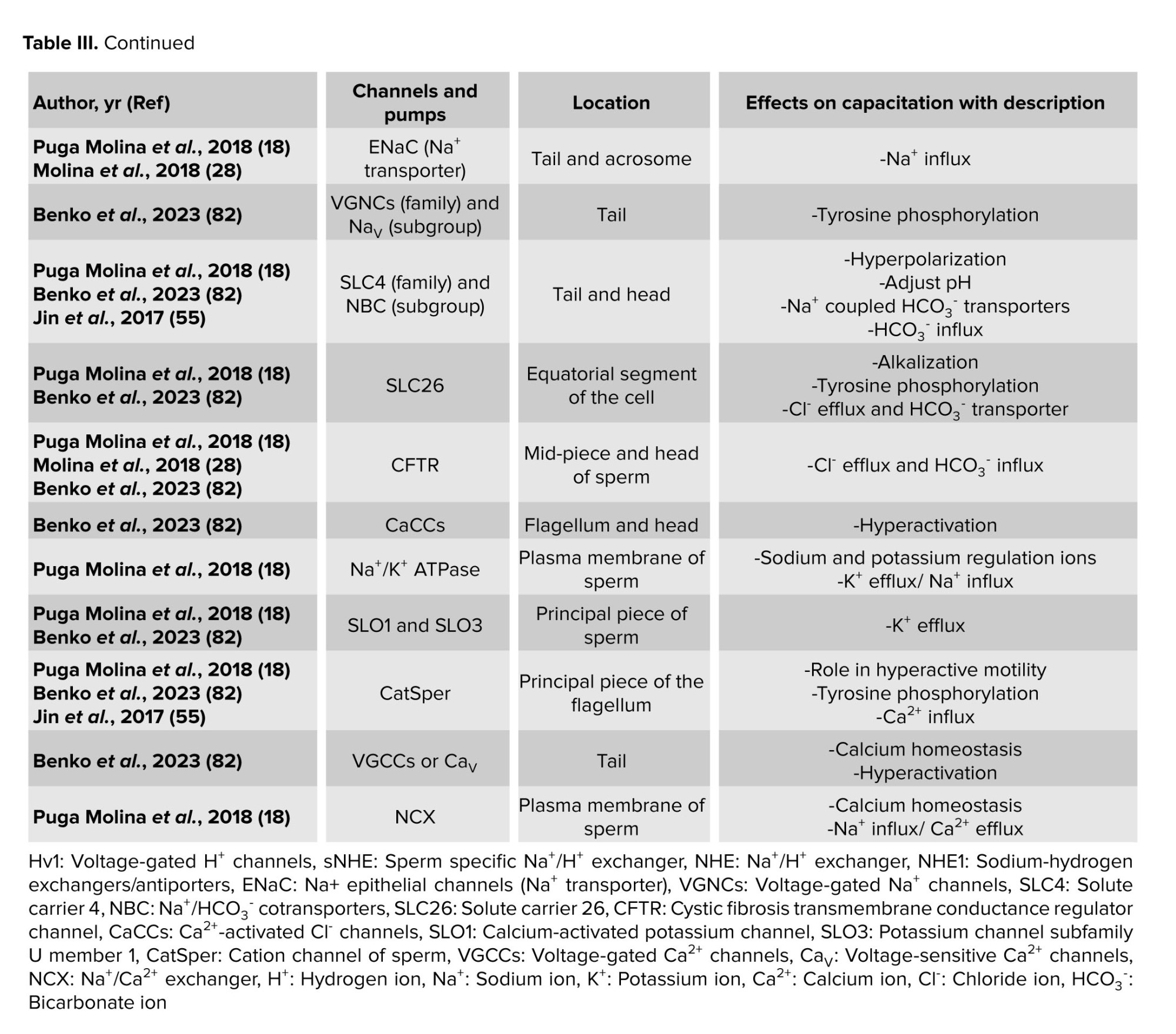 Certain ion channels in the sperm membrane, mostly made of proteins, aid in sperm capacitation. The behavior of these channels is dependent on the location and ionic changes of the surrounding environment. Consequently, capacitation is either caused by the activation or inactivation of these channels. The beginning of the capacitation cascades may be indicated by a change in the ions Ca2+, Na+, HCO3-, and H+. These channels may thus be referred to as both capacitation factors participating in the process and decapacitation factors that obstruct it (18). As a result, table III presents the individual sperm channels involved in determining the capacitation.