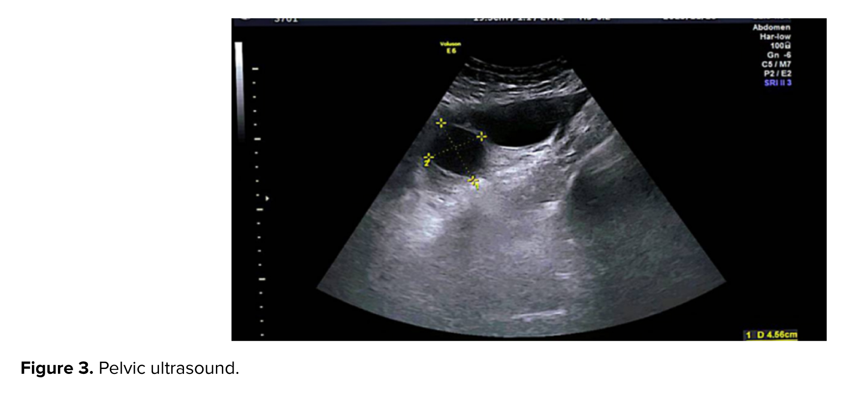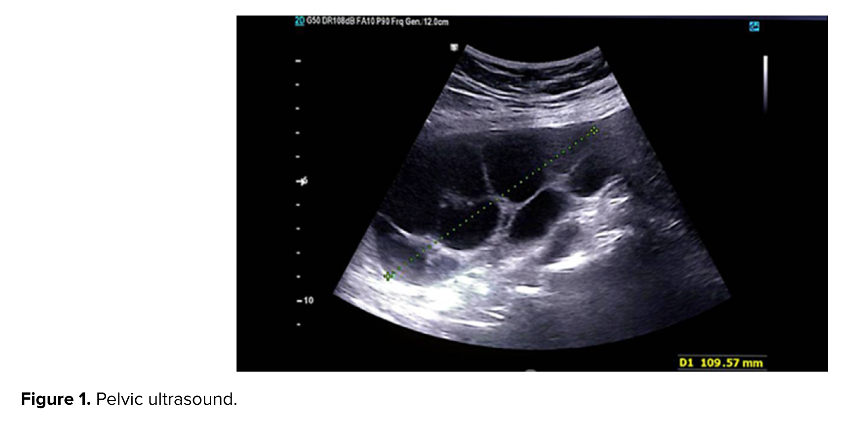 Complete blood count, liver function test, thyroid function tests, blood urea nitrogen, and creatinine tests were requested again, along with a chest X-ray. The test results and chest X-rays were normal. Due to heavy bleeding, the case underwent ultrasound-guided suction curettage again. Because the bleeding did not stop after suction curettage, the uterine catheter was fixed in the uterus with 40 cc of normal saline. According to the computed tomography scan of the pelvis and abdomen, the ovaries were larger than normal and contained multiple cysts, suggesting a theca lutein cyst. An ultrasound was performed one day after suction curettage. According to the ultrasound report, the myometrium was observed to be heterogeneous in the fundus, with increased vascularity, which could be indicative of invasion.