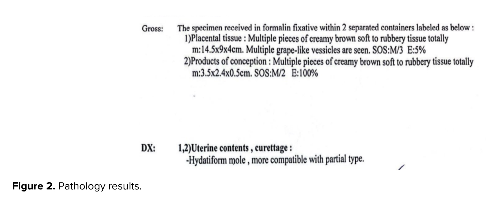 A sample of uterine tissue was sent to the laboratory for pathological examination. The endometrial tissue pathology results confirmed a partial hydatidiform mole (Figure 2).