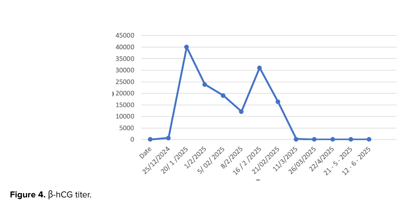 A week later, the patient returned complaining of relatively heavy vaginal bleeding. β-hCG titer was 16330. The patient was hospitalized, and the necessary tests were requested again. A uterine catheter was inserted into the uterus under ultrasound guidance. Oncology and interventional consultation were requested. According to the interventional report, color Doppler ultrasound showed no evidence of abnormal vascularity in the endometrium. Hence, she was started on a multi-day regimen every 2 wk by intramuscular methotrexate 90 mg. It was also injected on 28/02/2025, 02/03/2025, and 04/03/2025. Leucovorin 9 mg was injected intramuscularly on 27/02, 01/03, 03/03, and 05/03-2025. The patient was followed up with β-hCG titer checks until the level reached zero in 3 consecutive tests. Despite 3 negative β-hCG titers, the case continued to receive chemotherapy. It was recommended that the β-hCG titer follow-up be continued for the next 6 months. 3 months after completing chemotherapy, the patient’s beta-hash titer was negative, no vaginal bleeding was observed, and the patient was taking contraceptive low dose pills. β-hCG titer tests are reported in figure 4.