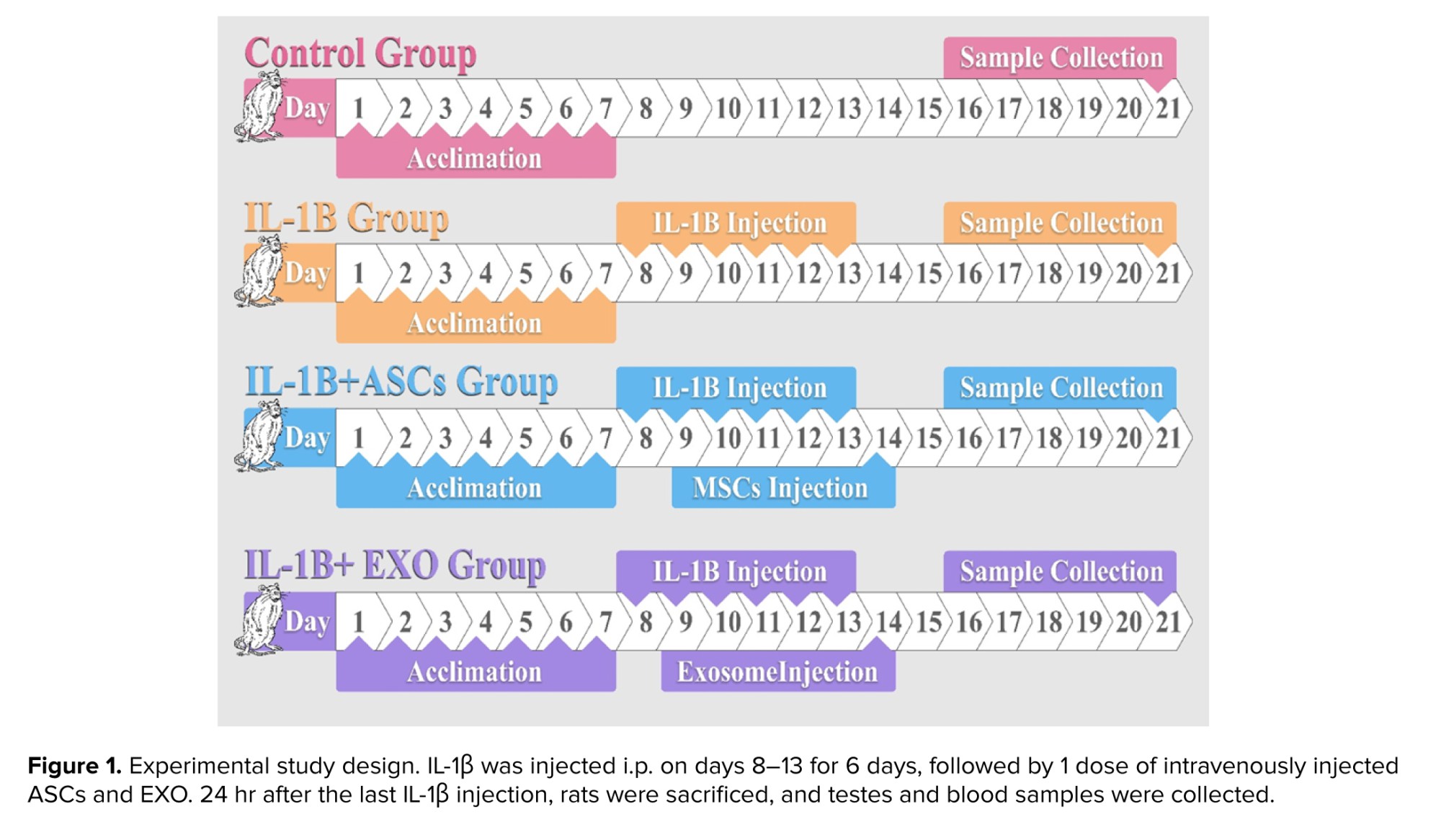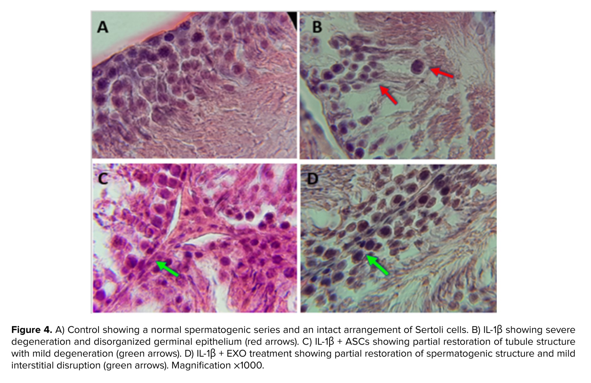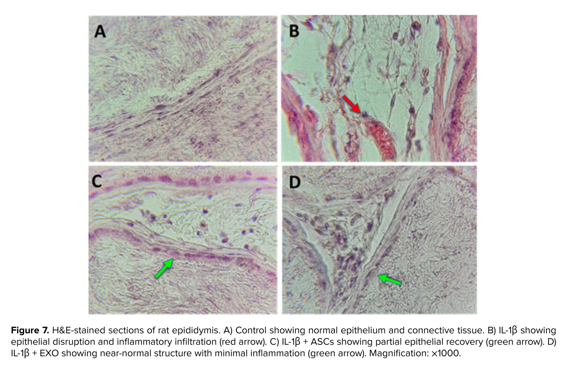 In the susceptible testicular microenvironment, IL-1β disrupts the blood-testis barrier, induces leukocyte infiltration, and impairs spermatogenesis, mirroring the pathophysiology of sterile orchitis (5). Using IL-1β to induce inflammation allows precise, reproducible control while avoiding endotoxin confounders. Its clinical relevance is underscored by the efficacy of IL-1-targeted therapies in human disorders, making this a translatable platform for evaluating novel interventions like adipose-derived stem cells (ASCs) and their exosomes (EXO) (6, 7).