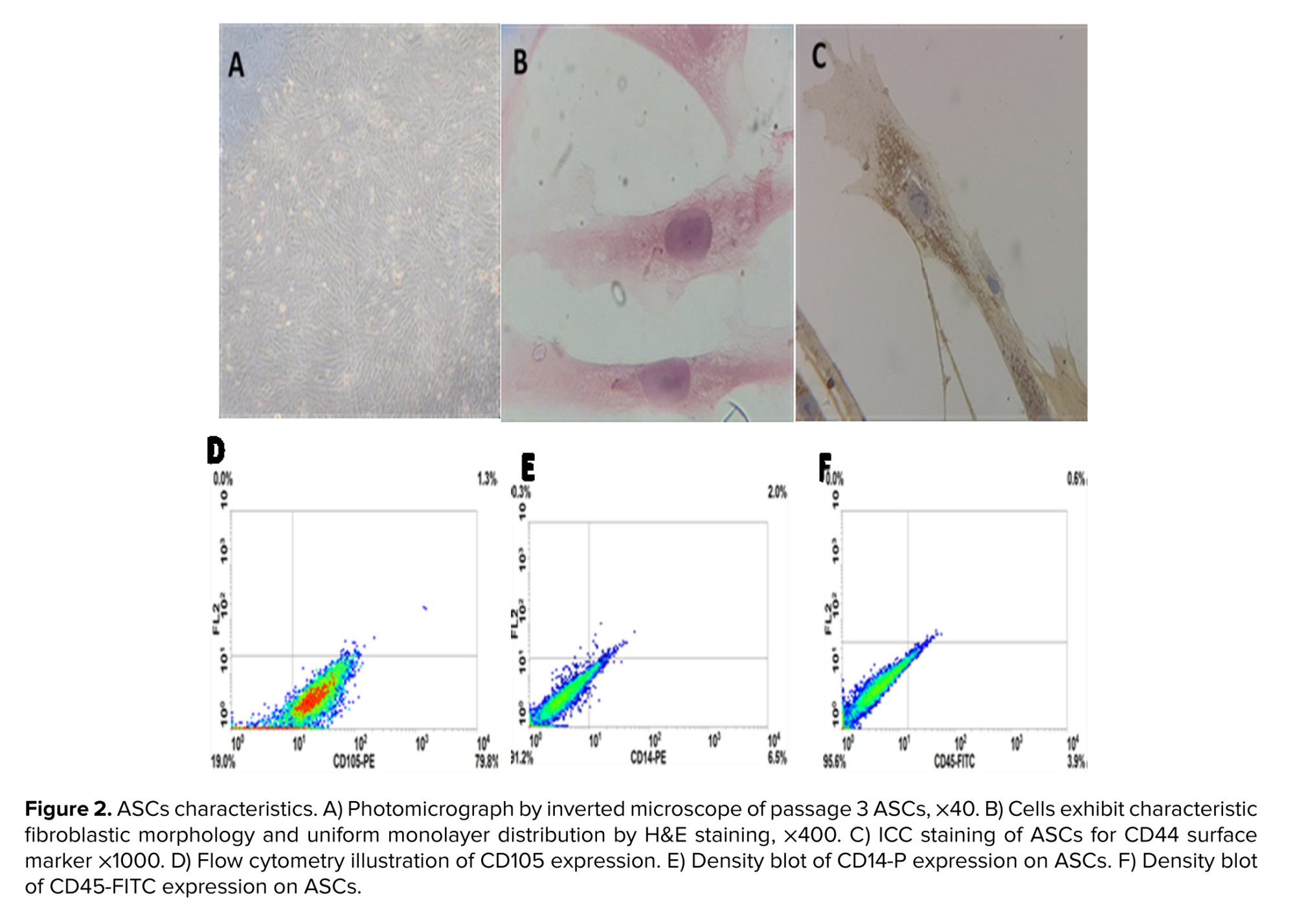 ASCs exhibited typical fibroblastic morphology and formed a homogeneous monolayer. Immunophenotyping confirmed MSC identity, with positive expression of CD44 and CD105 (79.8%) and positive expression of CD14 (91.2%) and CD45 (95.6%) (Figure 2A-F).