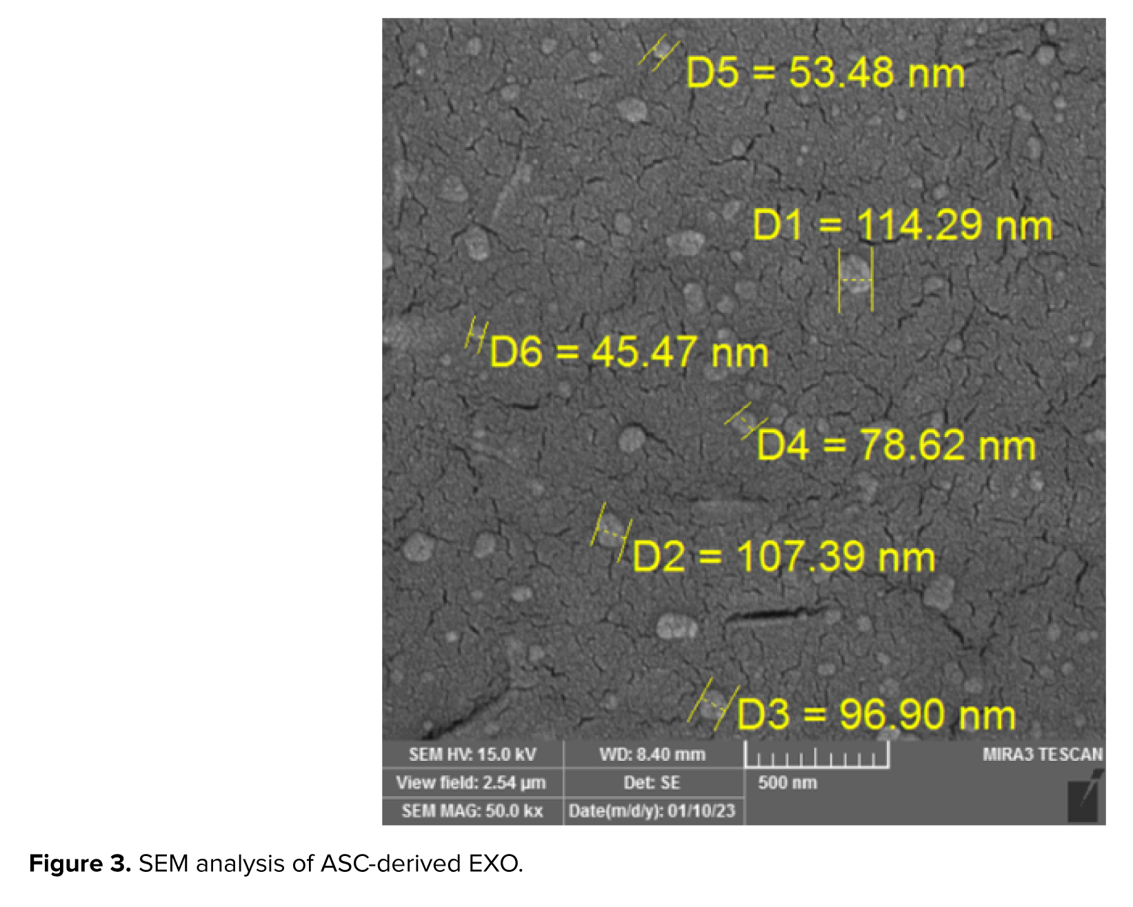 SEM showed the typical cup-shaped morphology of ASC-derived EXO with a particle size distribution between 30 and 150 nm, with a prominent peak at around 150 nm (Figure 3).