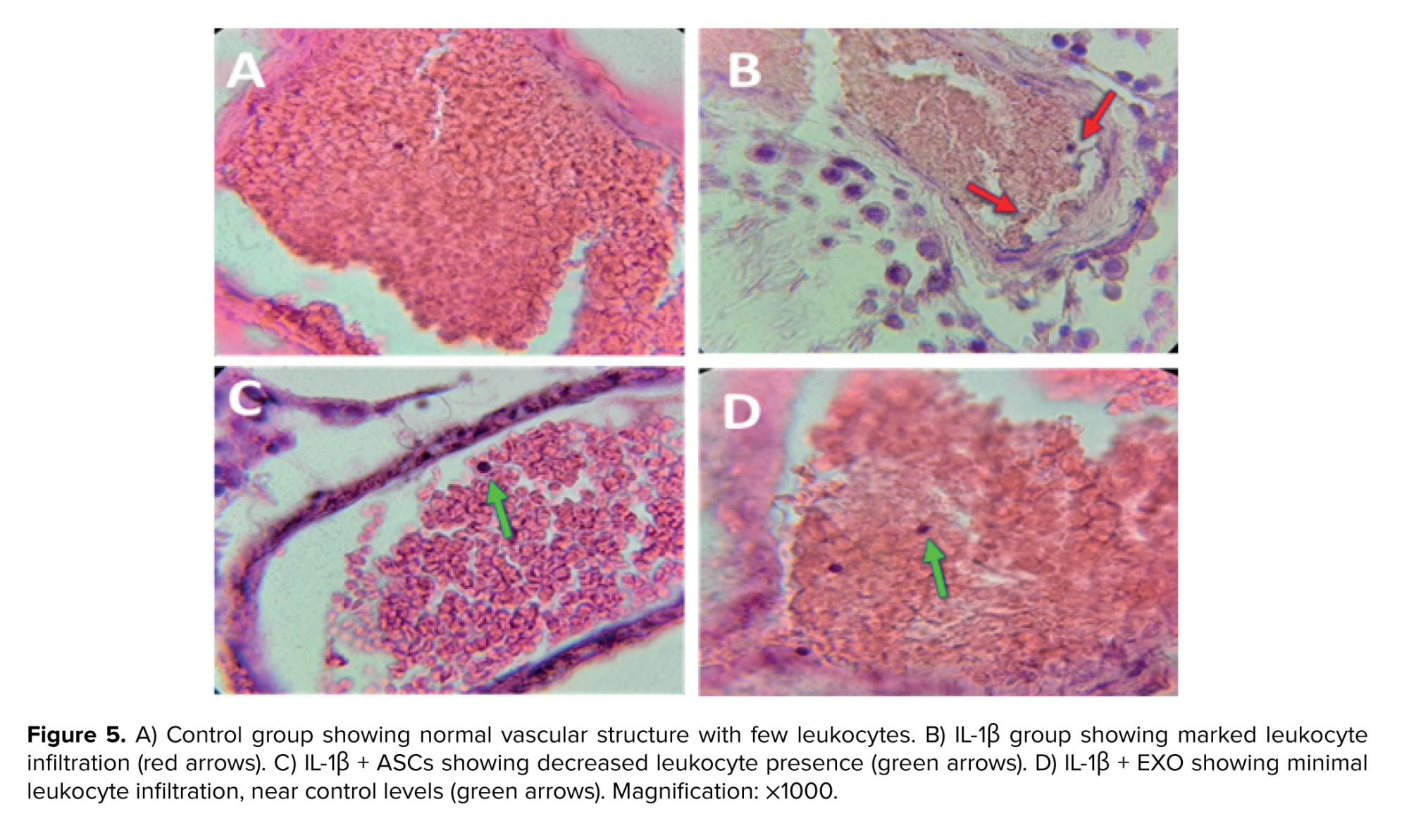 The significant increase in leukocyte count observed within the testicular interstitium and vasculature following IL-1β induction was histologically consistent with an influx of innate immune cells, primarily neutrophils, identifiable by their characteristic multi-lobed nuclei, along with mononuclear cells such as lymphocytes and monocytes/macrophages. This cellular profile is a standard response to acute inflammation, as IL-1β is a potent mediator for endothelial activation and the recruitment of these specific leukocyte populations. The notable reduction in these infiltrating cells following ASC and EXO treatments underscores their potent immunomodulatory effects, with leukocyte quantification data critically revealing that EXO achieved a 44% greater reduction than ASCs (p = 0.011). This finding underscores the superior capacity of EXO to disrupt chemokine-mediated recruitment pathways and resolve local inflammation within the testicular environment, likely through a more efficient delivery of paracrine factors (21).