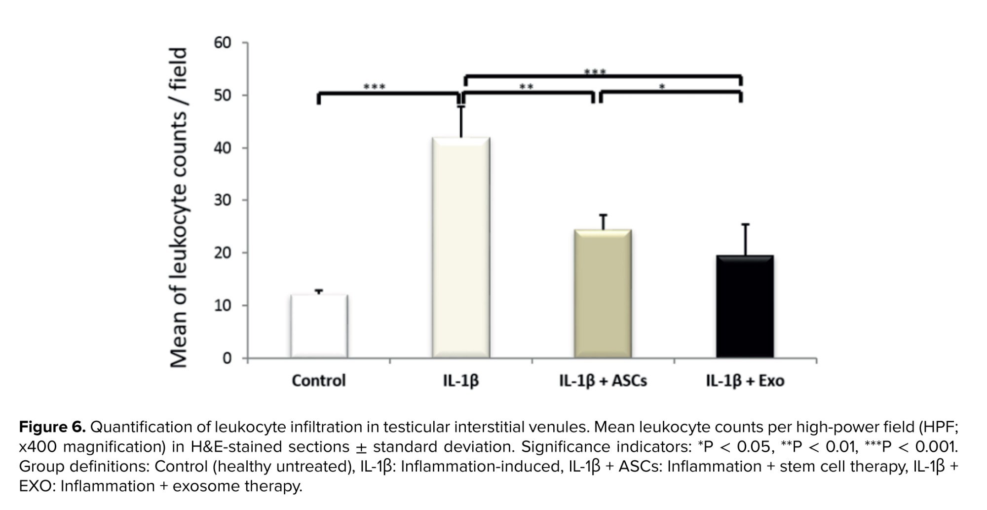 In conclusion, EXO appeared more effective in total, possibly due to better bioavailability and paracrine signaling (18-20). Their ability to concurrently resolve local inflammation (leukocyte reduction), restore tissue architecture, and normalize systemic biomarker positions them as a next-generation therapeutic platform for testicular inflammation and related infertility. Future research should prioritize clinical translation via scalable production, delivery optimization, and validation of functional reproductive recovery.