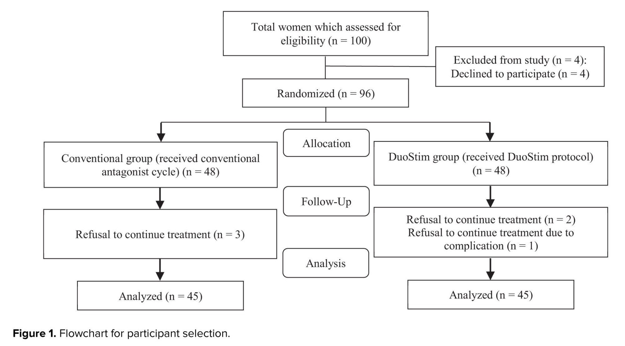 Based on a study by Ghahghayi et al. (14), the mean oocyte yield was 9.2 (DuoStim) vs. 6.9 (conventional) with an standard deviation of 3.8. With α = 5%, power = 80%, and 5% margin of error, 45 participants per group (N = 90) were required. We have 10 sample losses in this study (Figure 1). The used formula is:
