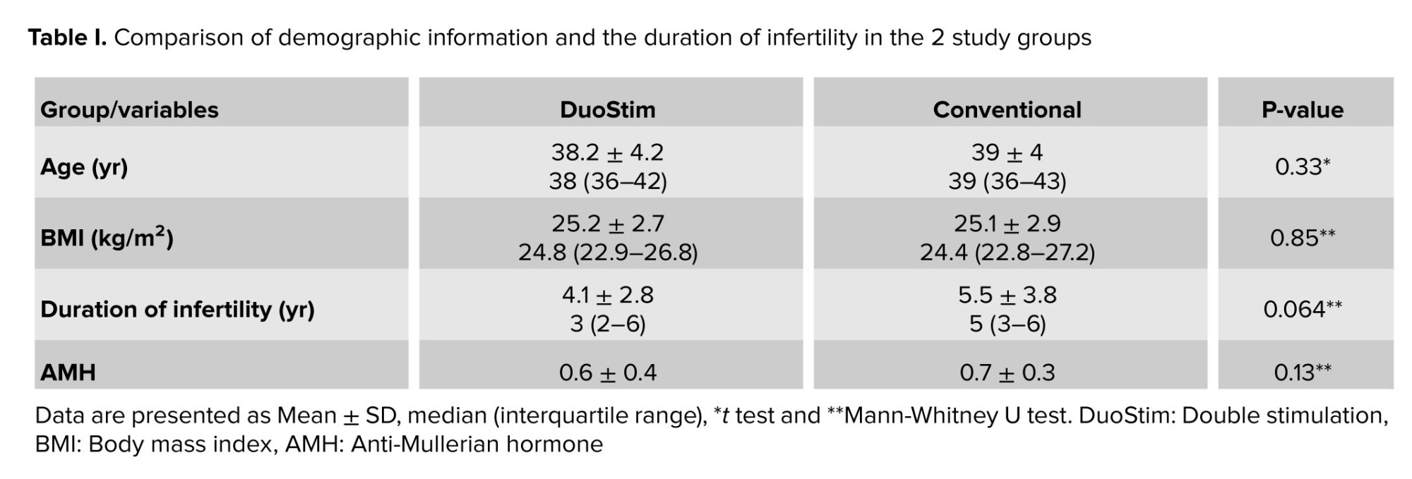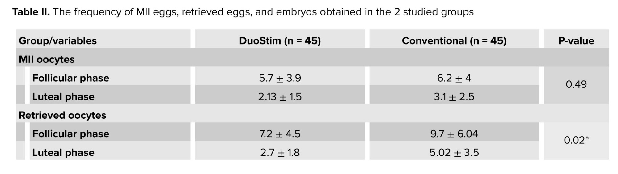 This study involved 100 infertile women with reduced ovarian reserve, participants were randomly assigned to either the DuoStim protocol or the conventional antagonist cycle. After withdrawals, 45 participants remained in each group for analysis. The mean age of all women was 38.6 ± 4.1 yr, and the mean boby mass index was 25.1 ± 2.8 kg/m². The median of the duration of infertility in DuoStim cases was 3, and in the conventional group was 5; no significant differences were observed between the 2 groups (Table I). Anti-Müllerian hormone levels did not differ significantly between groups (p = 0.25) (Table II). The mean number of mature metaphase II oocytes was similar between the DuoStim (5.7 ± 3.9) and control groups (6.2 ± 4, p = 0.53). However, the total number of retrieved eggs was significantly lower in the DuoStim group (7.2 ± 4.5) compared to controls (9.7 ± 6, p = 0.026). Embryo numbers were comparable (4.5 ± 3.5 vs. 4.7 ± 3.1, p = 0.73). In the DuoStim group, second round measures of eggs, mature oocytes, and embryos were significantly higher than the first round (p = 0.035, p = 0.049, p = 0.028). Notably, the duration of ovarian stimulation was significantly shorter in the DuoStim group (p = 0.002). These results suggest that DuoStim can achieve similar mature oocyte and embryo yields in less stimulation time compared to conventional protocols, although with fewer total eggs retrieved (Table III).