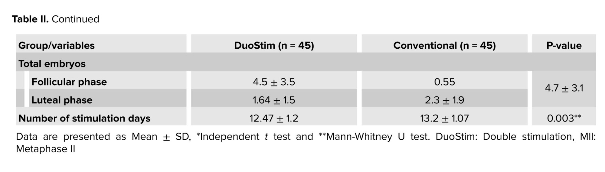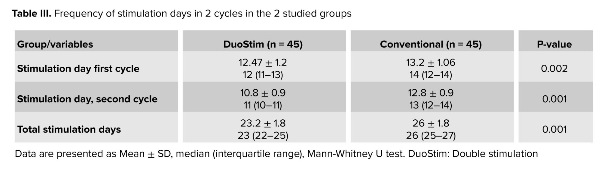 The mean of stimulation days in 2 cycles and the total were lower in the DuoStim group than the conventional group, and the difference was significant. The difference between stimulation days comes from data without any explanation (Table III).