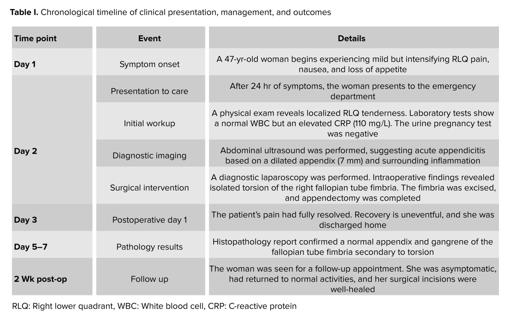 A 47-yr-old, gravida 2, para 2 woman presented to the emergency department with a 24-hr history of progressively intensifying RLQ abdominal pain, accompanied by nausea and anorexia. She had no significant past medical, surgical, or family history, specifically denying any prior abdominal surgeries or known gynecological conditions. Her menstrual cycle was regular, with her last period occurring 2 wk prior.
