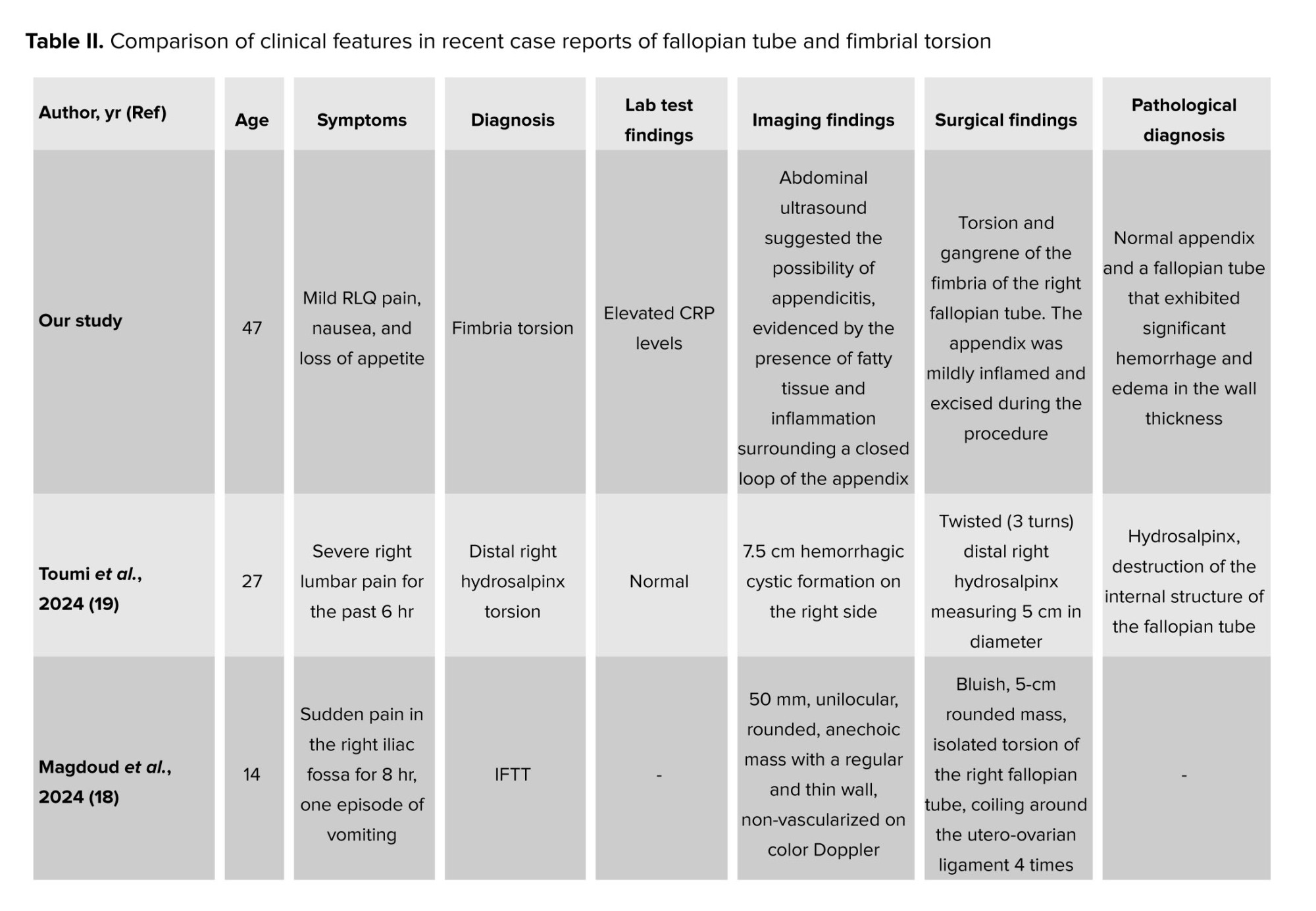 Comparison with recent literature reveals both similarities and distinctions. Our case patient (47 yr old) is older than the typical demographic for torsion; however, this finding aligns with other cases reported in perimenopausal women. The clinical presentation, characterized by RLQ pain that mimics acute appendicitis, was consistent with findings from another report, thus emphasizing this common diagnostic challenge. A notable differentiating factor in many reviewed cases was the presence of associated adnexal pathology, such as a paratubal cyst or hydrosalpinx, which was believed to act as a precipitating factor for torsion. This case was significant because it describes isolated fimbrial torsion in the absence of predisposing anatomical factors, such as a paratubal cyst. This comparison highlights that, while clinical demographics and underlying pathologies may differ, the risk of fimbrial and tubal torsion presenting as a more common acute surgical abdomen remains a critical diagnostic pitfall (16-20).