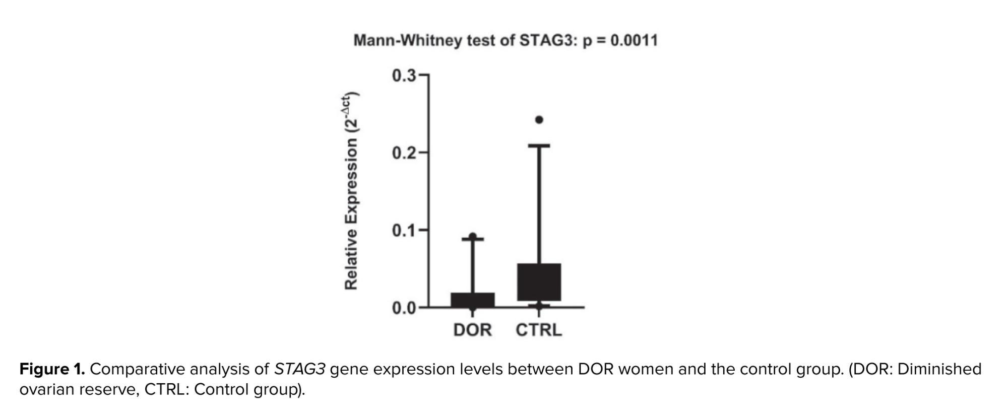 Quantitative real-time PCR analysis revealed significant downregulation of STAG3 gene expression in PBMCs of women with DOR compared to healthy controls. The relative expression analysis demonstrated a statistically significant reduction in STAG3 mRNA levels (p = 0.0011, Figure 1), indicating potential involvement of this meiotic recombination gene in the pathophysiology of DOR.