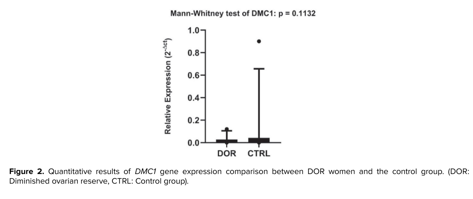 The expression analysis of the DMC1 gene in PBMCs revealed a tendency toward reduced expression in DOR women compared to controls; however, this reduction did not reach statistical significance (p = 0.1132, Figure 2). Although the downregulation pattern was consistent with the STAG3 findings, the lack of statistical significance suggests that DMC1 expression changes may be more subtle or require larger sample sizes for detection.