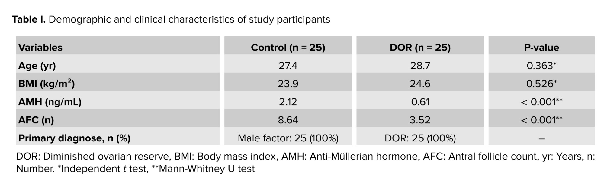 A total of 50 participants were enrolled in this case-control study, comprising 25 women with DOR and 25 healthy controls. The demographic analysis (Table I), revealed that the mean age of DOR women was 28.7 yr, compared with 27.4 yr in the control group, with no statistically significant difference between the groups (p > 0.05). Similarly, BMI values showed no significant variation between DOR women (24.6 kg/m²) and controls (23.9 kg/m²), indicating successful matching of participants for this potential confounding variable.