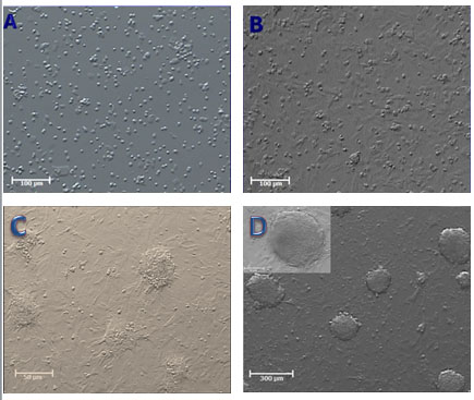 Figure 1. Morphology and characterization of primary cell cultures and colony formation of mouse neonate testis (A) Cell population obtained from the seminiferous tubules (B) morphology of primary neonate mouse testis cells, cultured in free-growths factors DMEM/F12, 24 h after primary culture (C) Colonies of spermatogonial stem cells (SSCs) after 5 days of culture (D) Colonies of spermatogonial stem cells (SSCs) after 2 weeks of culture.
