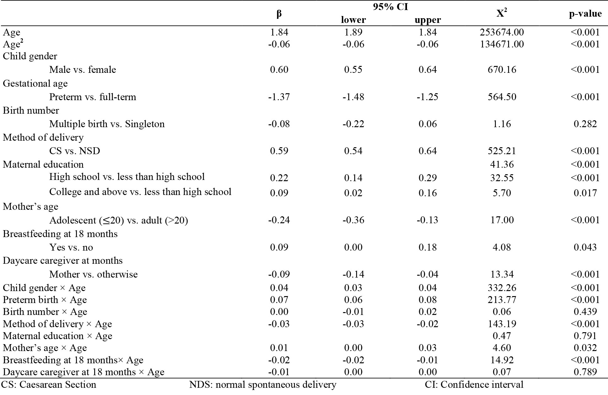 Adolescent mothers were negatively associated with birth BW, BH and HC; however, the predictive power no longer existed over the time. Breastfeeding was negatively associated with growth change with age (p<0.001 for BW, BH and HC). Cesarean sections were positively correlated with the changes in BW (β= 2.72, p<0.05) and BH (β= 0.02, p<0.001), however, negatively correlated to HC (β= -0.03, p<0.001). The variable of mother as the primary daycare caregiver negatively contributed the change in BW (β= -4.86, p<0.001) and no significant effect on BH and HC. Multiple births and educational levels were not significantly associated with the growth changes.