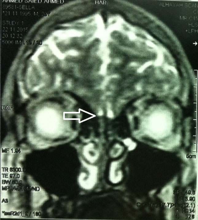 Figure 1. MRI scan of the brain identifying deficiency of the olfactory bulbs; the arrow denotes the presumed location of the olfactory bulbs.